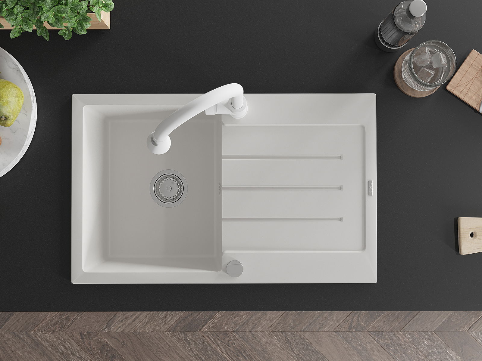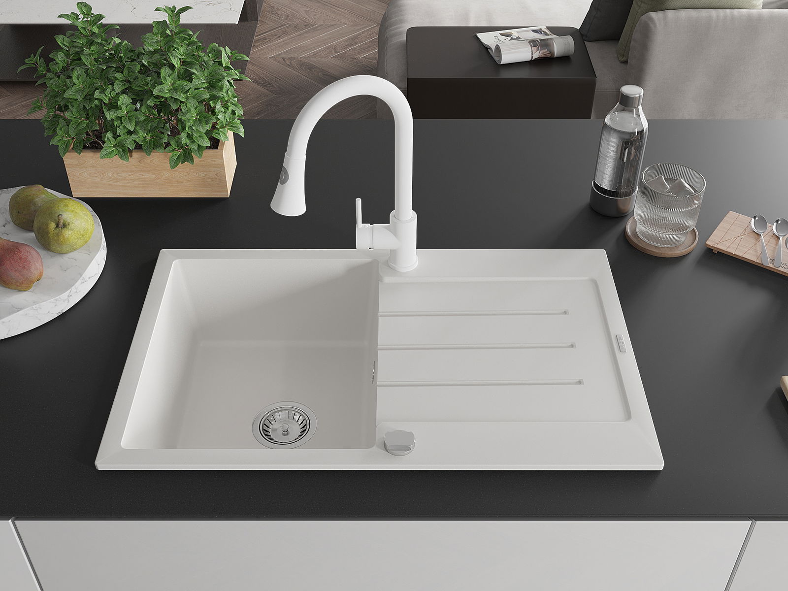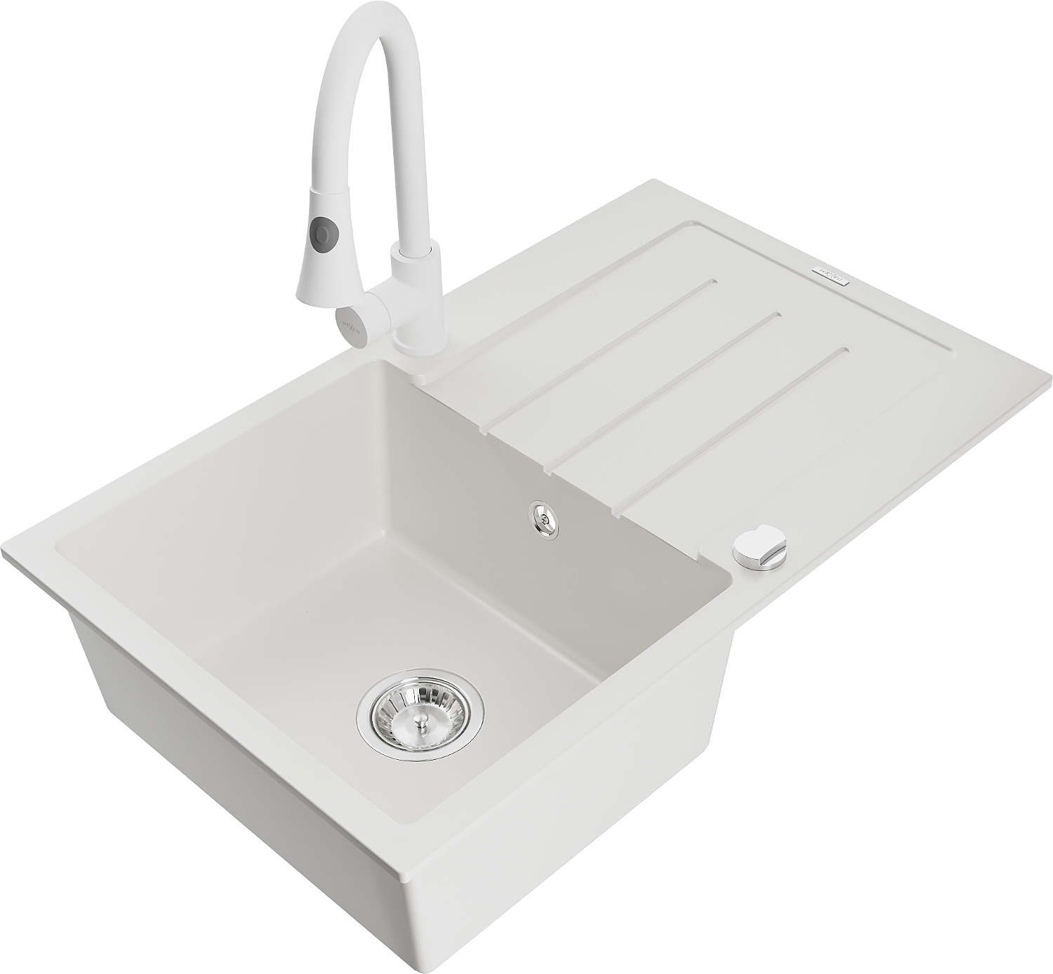 Mexen Bruno еднокоморова гранитна мивка с отцедник и кухненски смесител Elia, бял - 6513-20-670101-20
