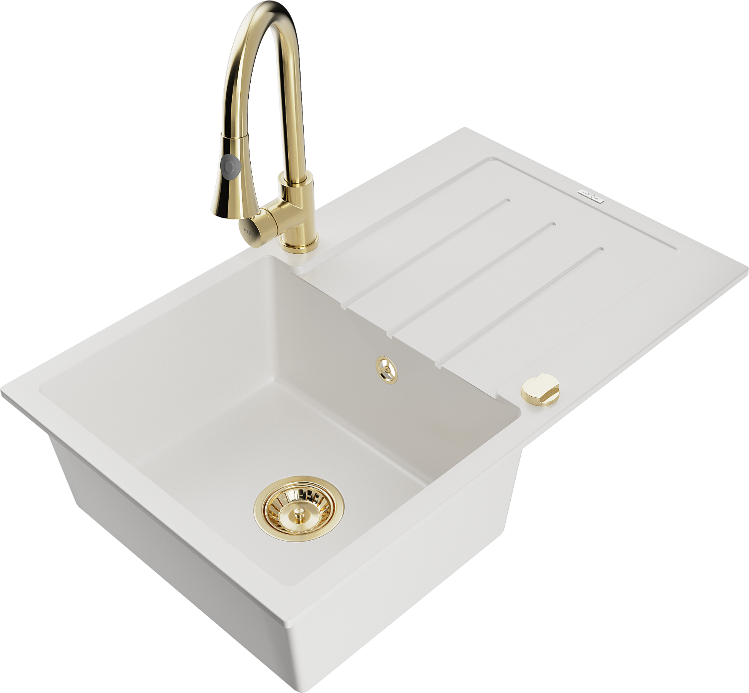 Mexen Bruno гранитна мивка с 1 отделение с отцедник и кухненски смесител Elia, бял - 6513-20-670101-50
