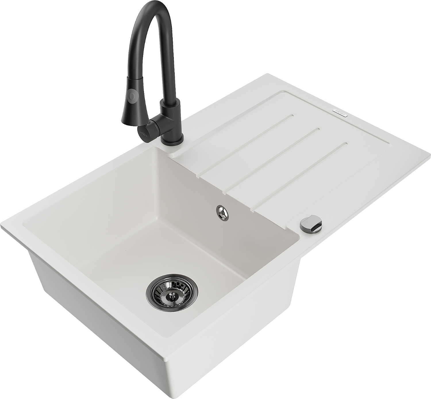 Mexen Bruno гранитна мивка с 1 отделение с отцедник и кухненски смесител Elia, бял - 6513-20-670101-70