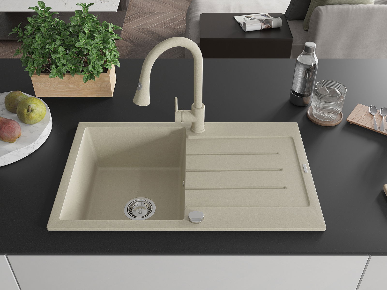 Mexen Bruno кухненска мивка от гранит с 1 отделение и сушилня и кухненски смесител Elia, бежов - 6513-69-670101-69