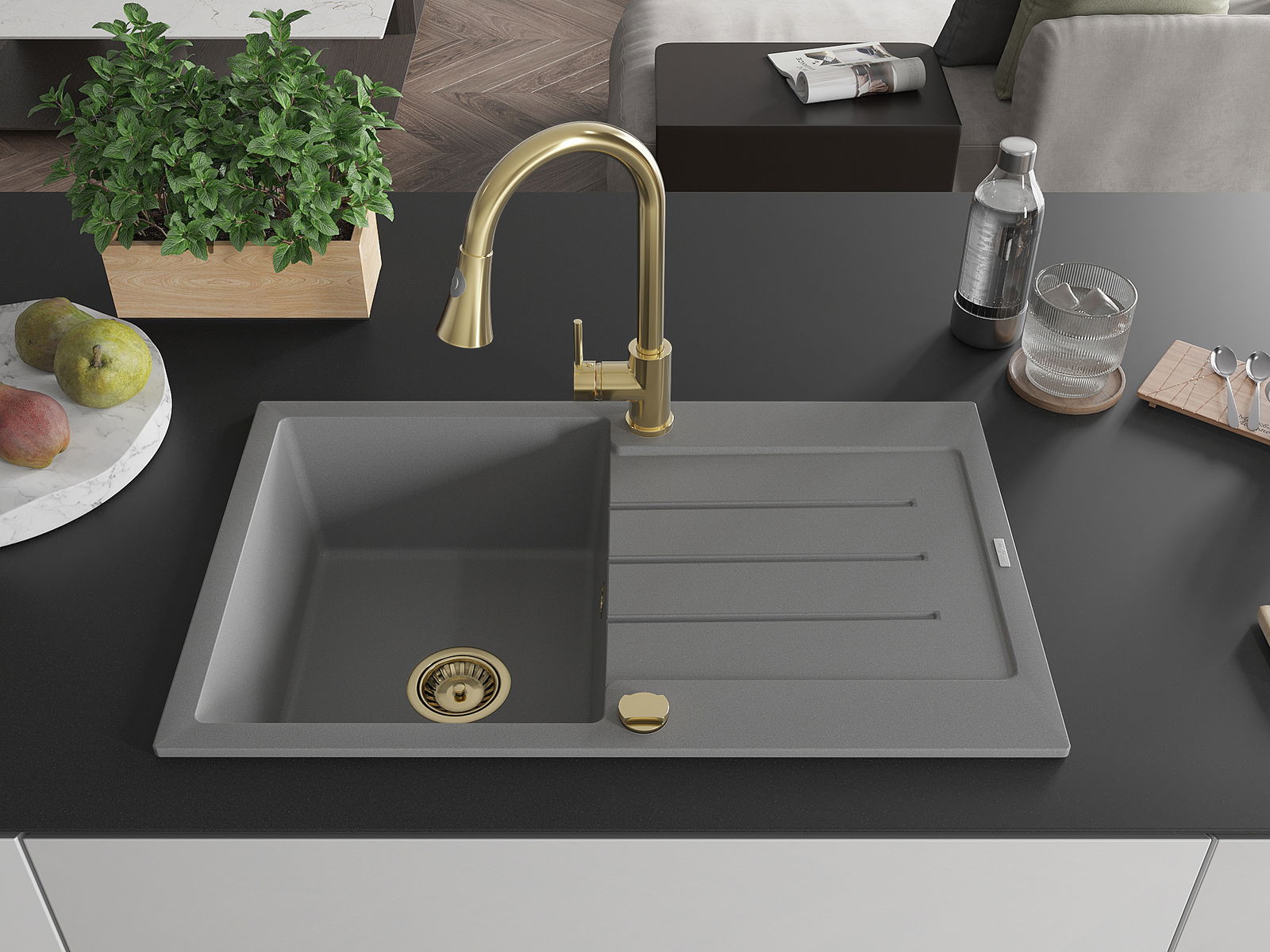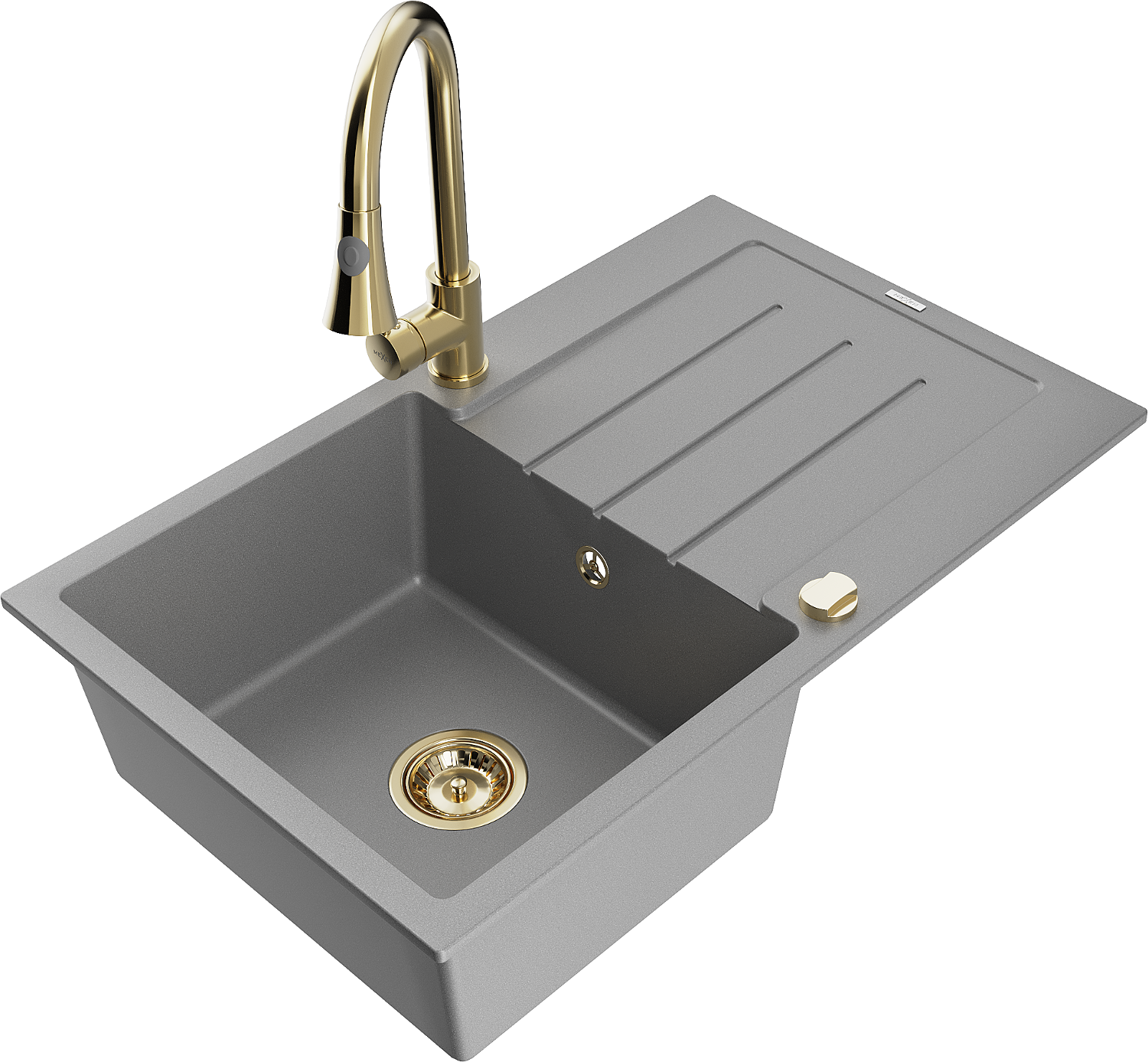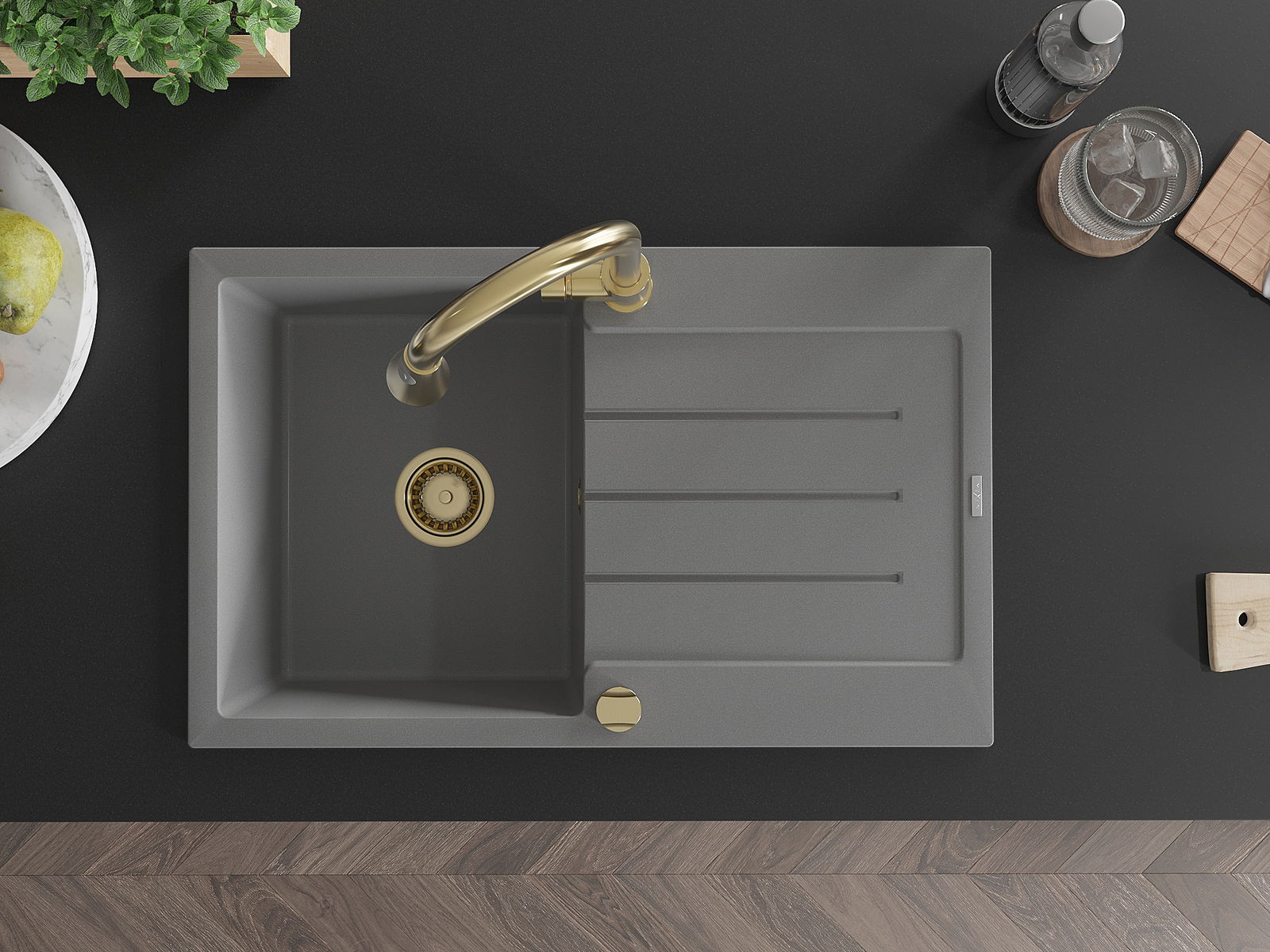 Mexen Bruno кухненска мивка гранитна 1-камерна с отцедник и кухненски смесител Elia, сива - 6513-71-670101-50