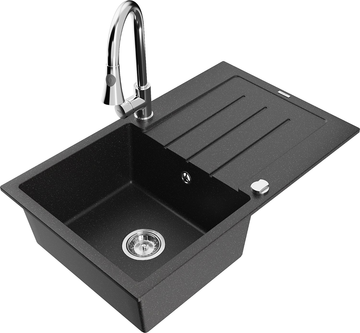 Mexen Bruno гранитна мивка с една купа с отцедник и кухненски смесител Elia,