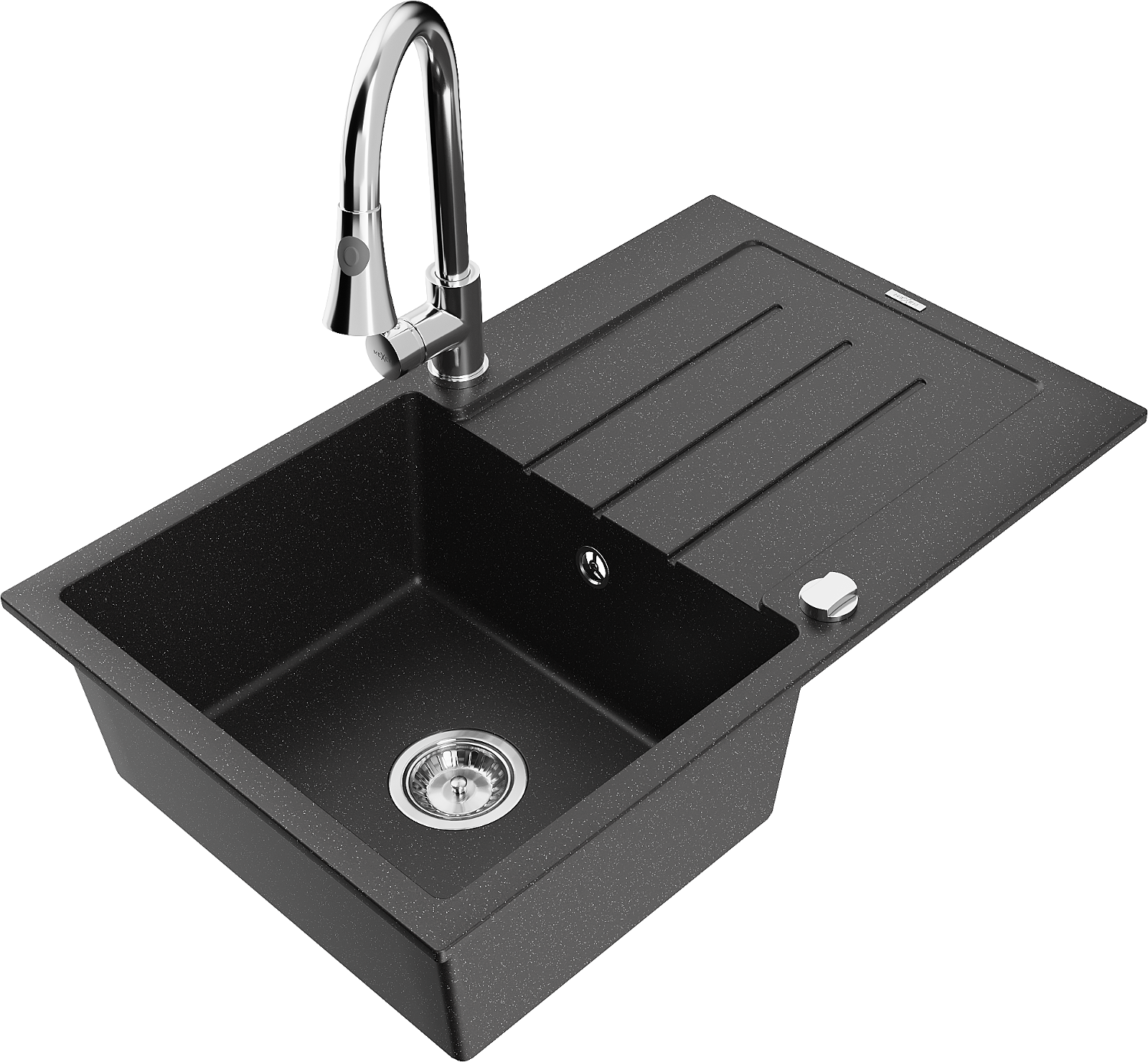 Mexen Bruno кухненска мивка от гранит с 1 камера с място за отцеждане и кухненски смесител Elia, черен/сребрист металик - 6513-?