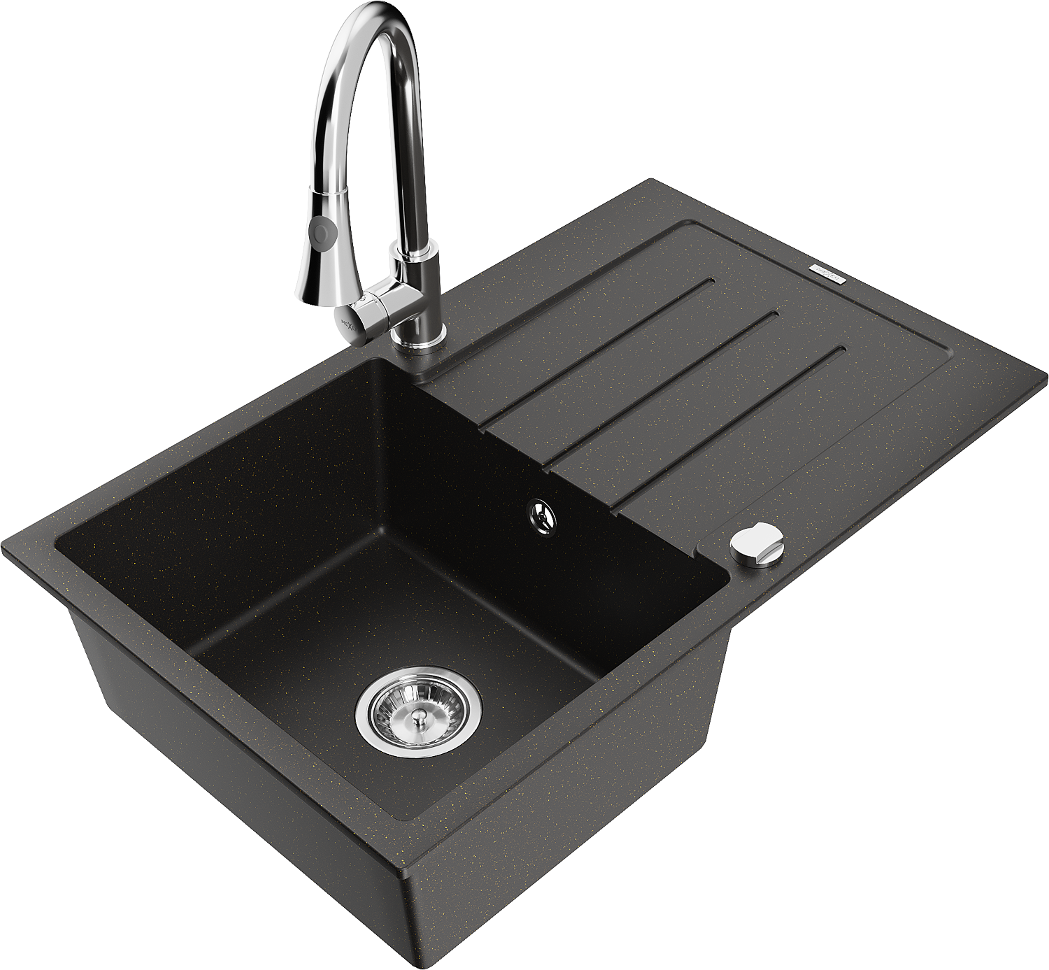 Мивка Mexen Bruno гранитна 1-отсекционна със сушилник и кухненски смесител Elia, черен/златист металик - 6513-75-670101-00