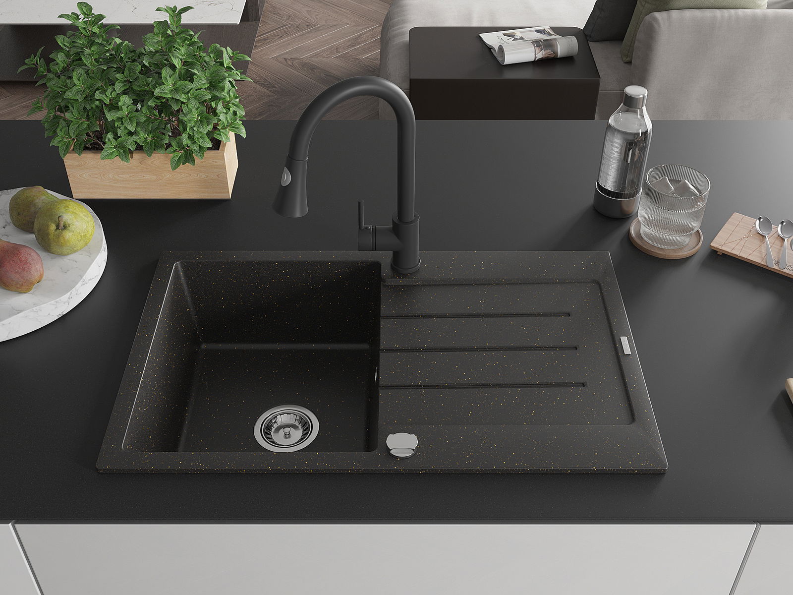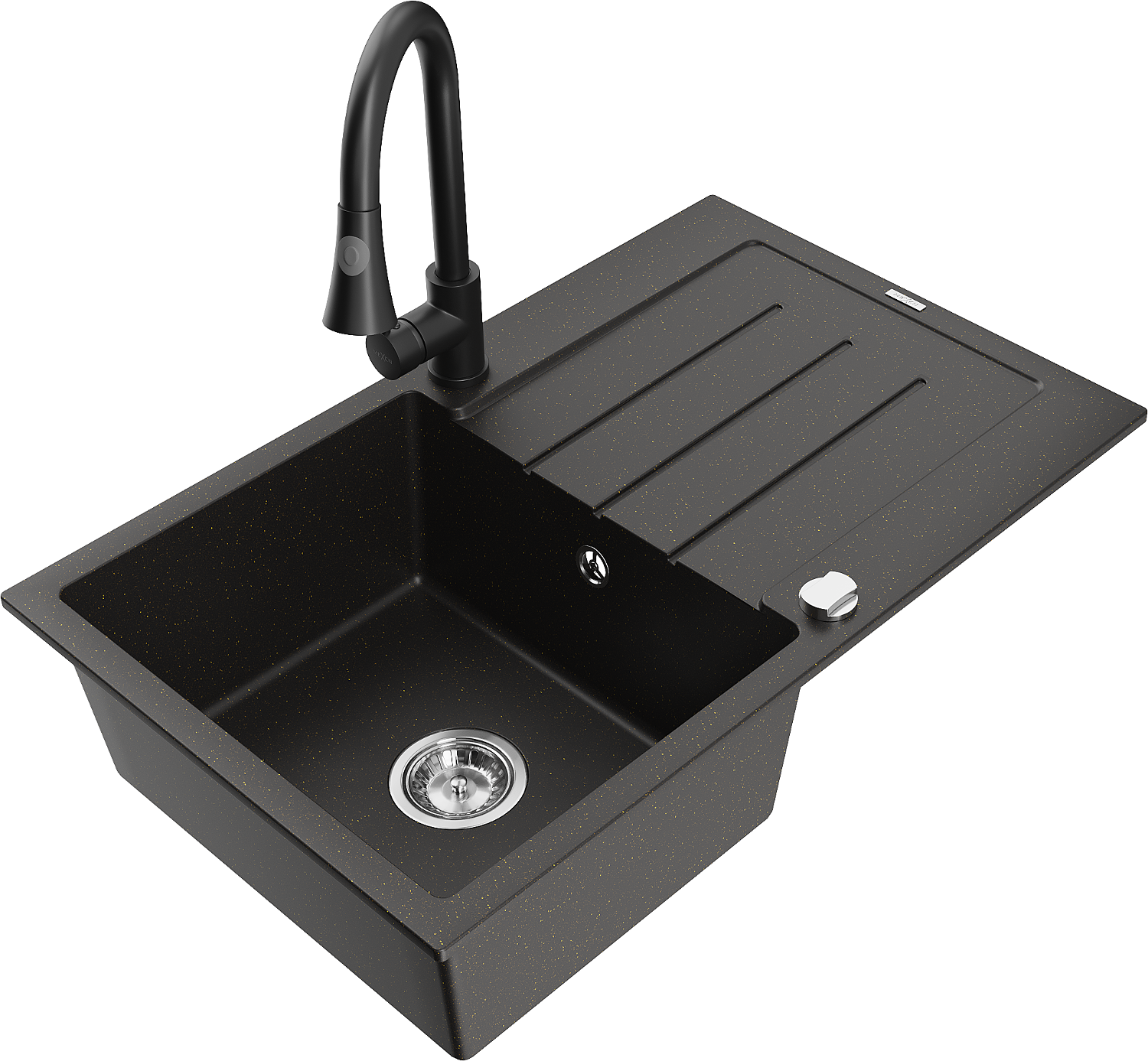 Mexen Bruno гранитна мивка с една камера с отцедник и кухненски смесител Elia, черно/златен металик - 6513-75-670101-70