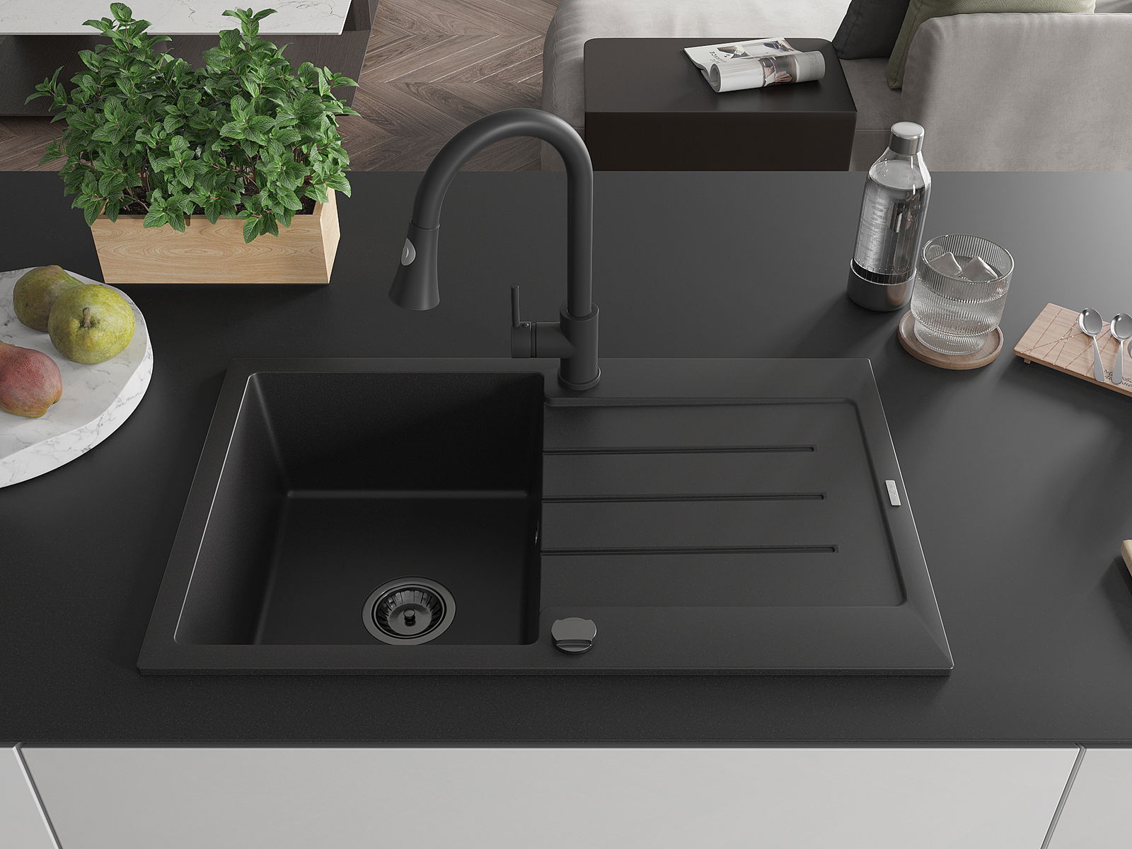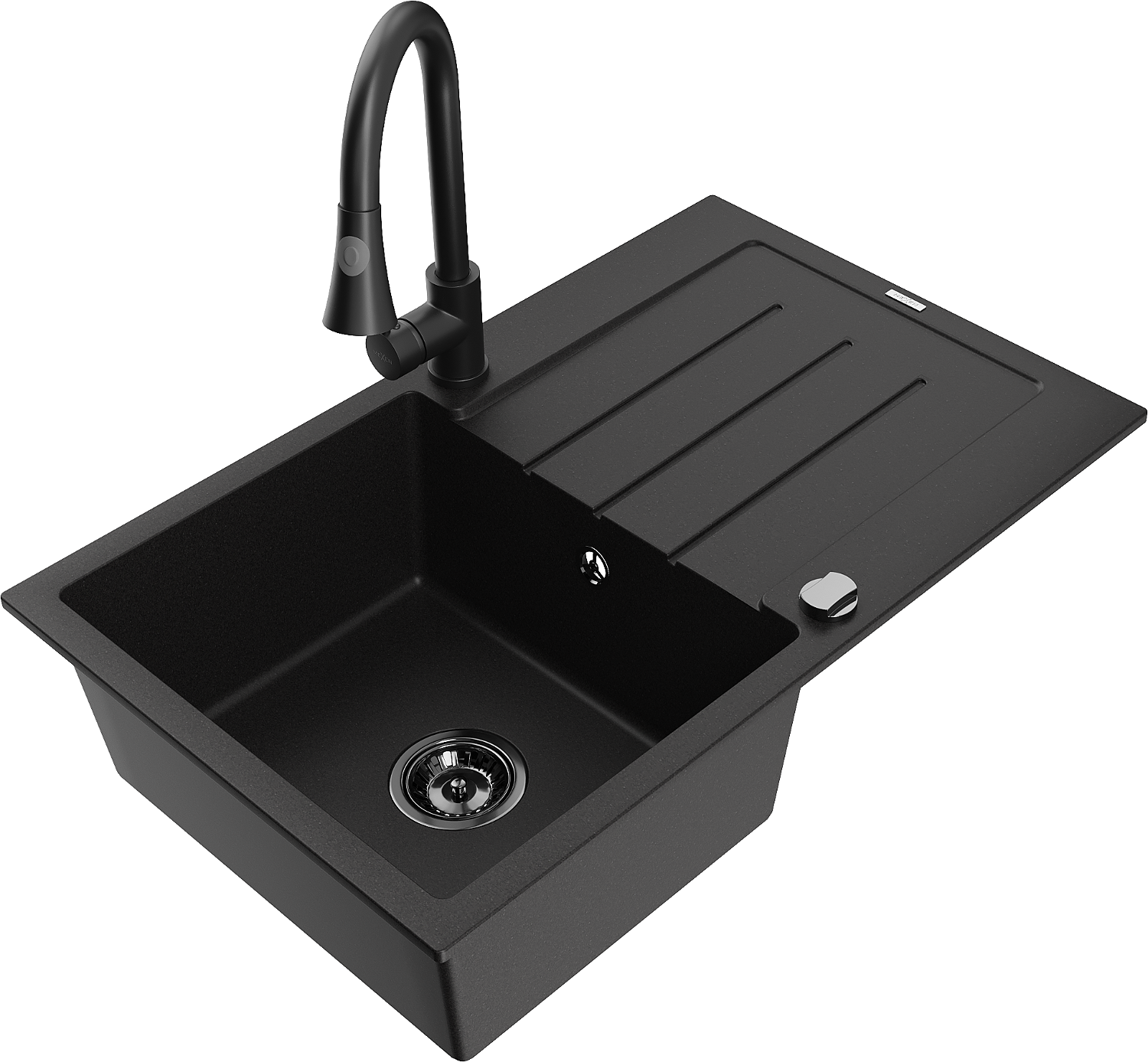 Mexen Bruno гранитна мивка с 1 камера с отцедник и кухненски смесител Elia, черен - 6513-77-670101-70-B