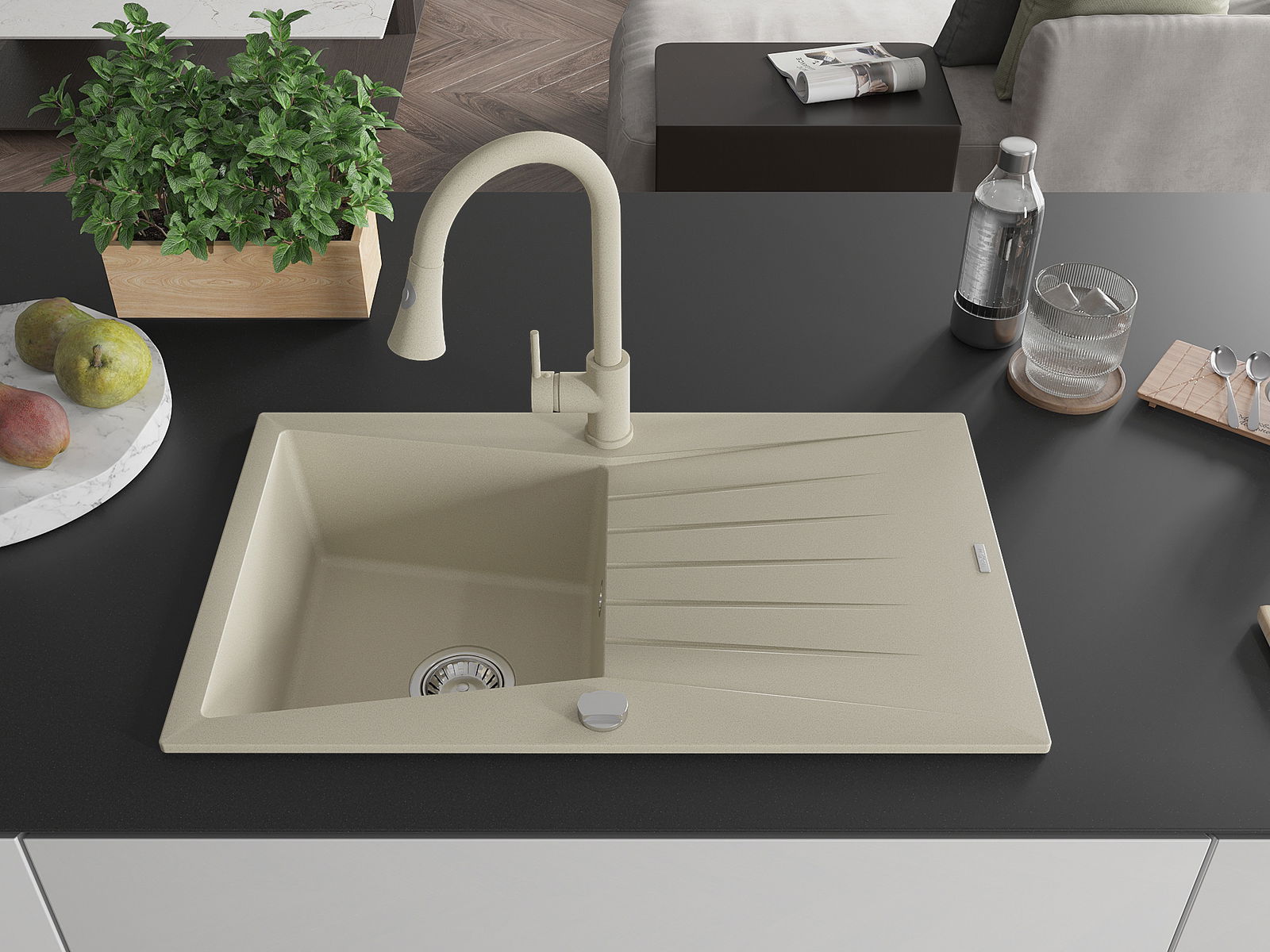 Мивката е направена от висококачествен гранит. Това е елегантно и най -вече практично допълнение към всяка кухня, независимо от нейния стил. Висококачествената и гранитна издръжливост осигуряват много години употреба.
