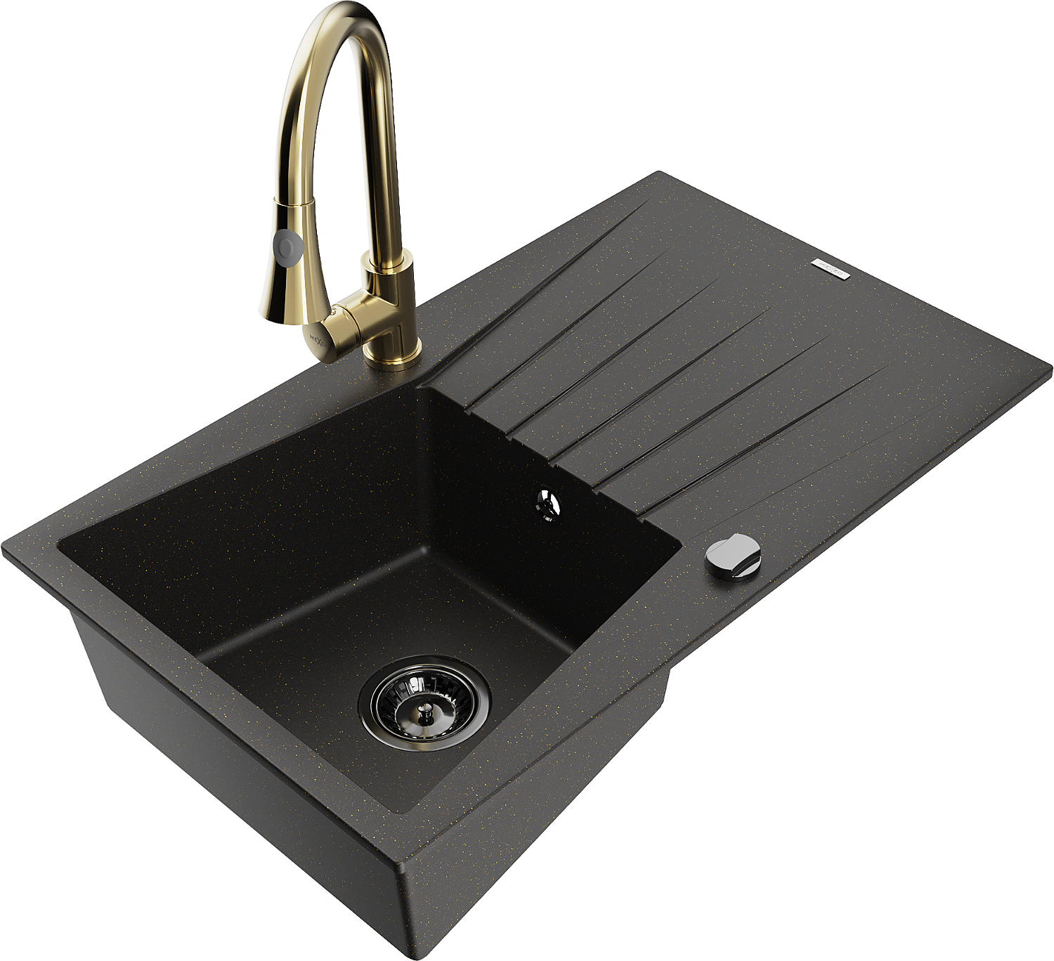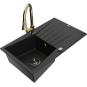 Mexen Cesar гранитна мивка с 1 отделение, с отцедник и кухненски смесител Elia, черен/златен металик - 6514-75-670101-50-B