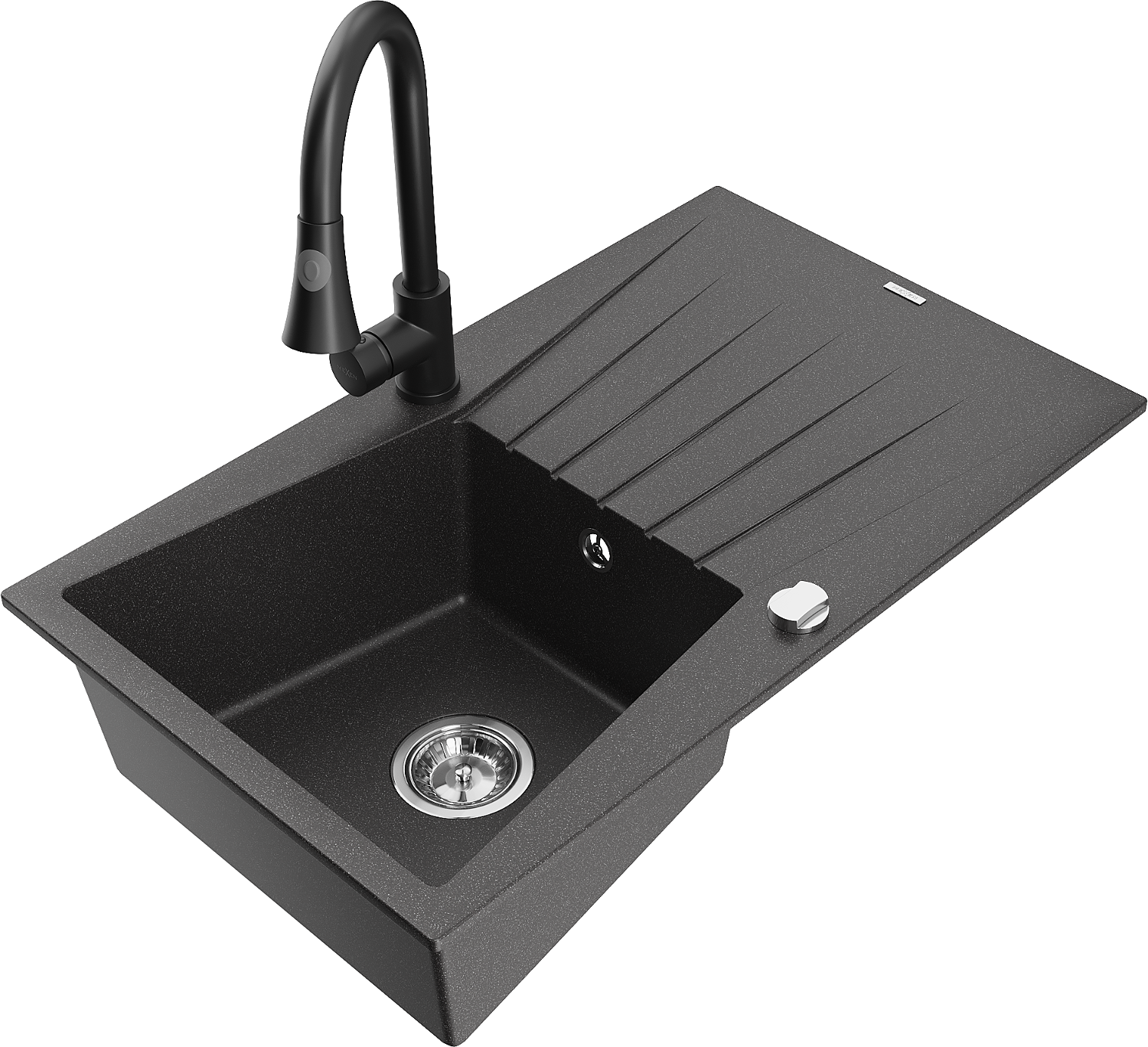 Mexen Cesar мивка гранитна 1-камерна с отцедник и кухненски кран Elia, черна на пръски - 6514-76-670101-70