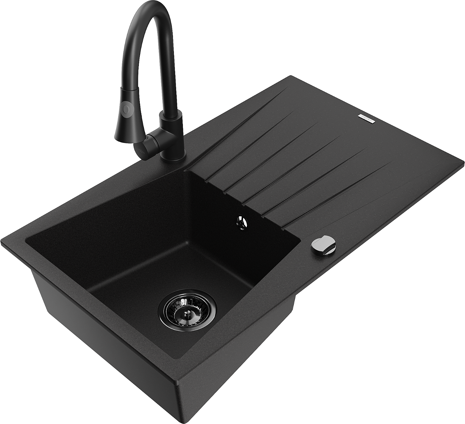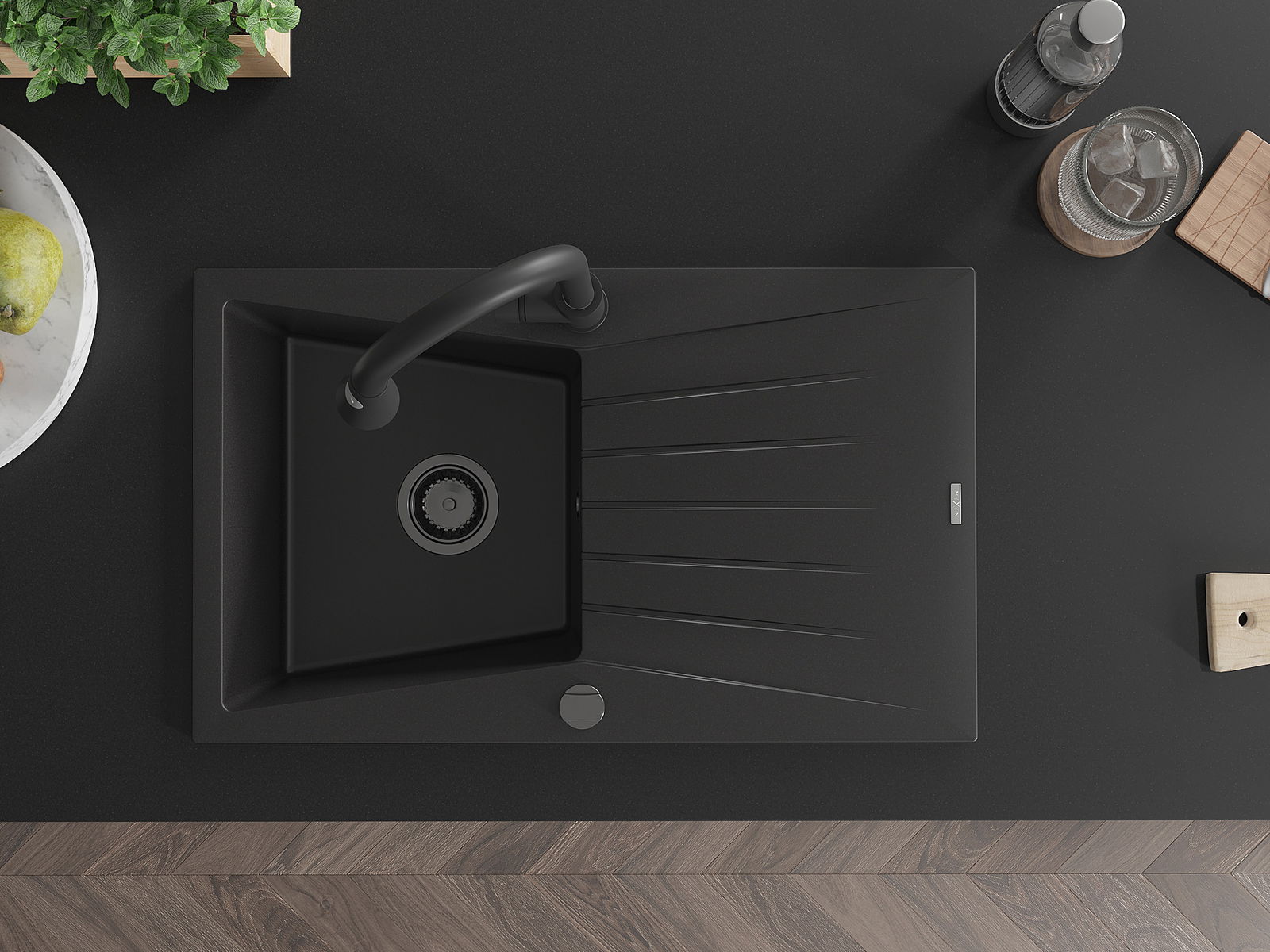 Mexen Cesar гранитна мивка с 1-корито с отцедник и кухненски смесител Elia, черен - 6514-77-670101-70-B
