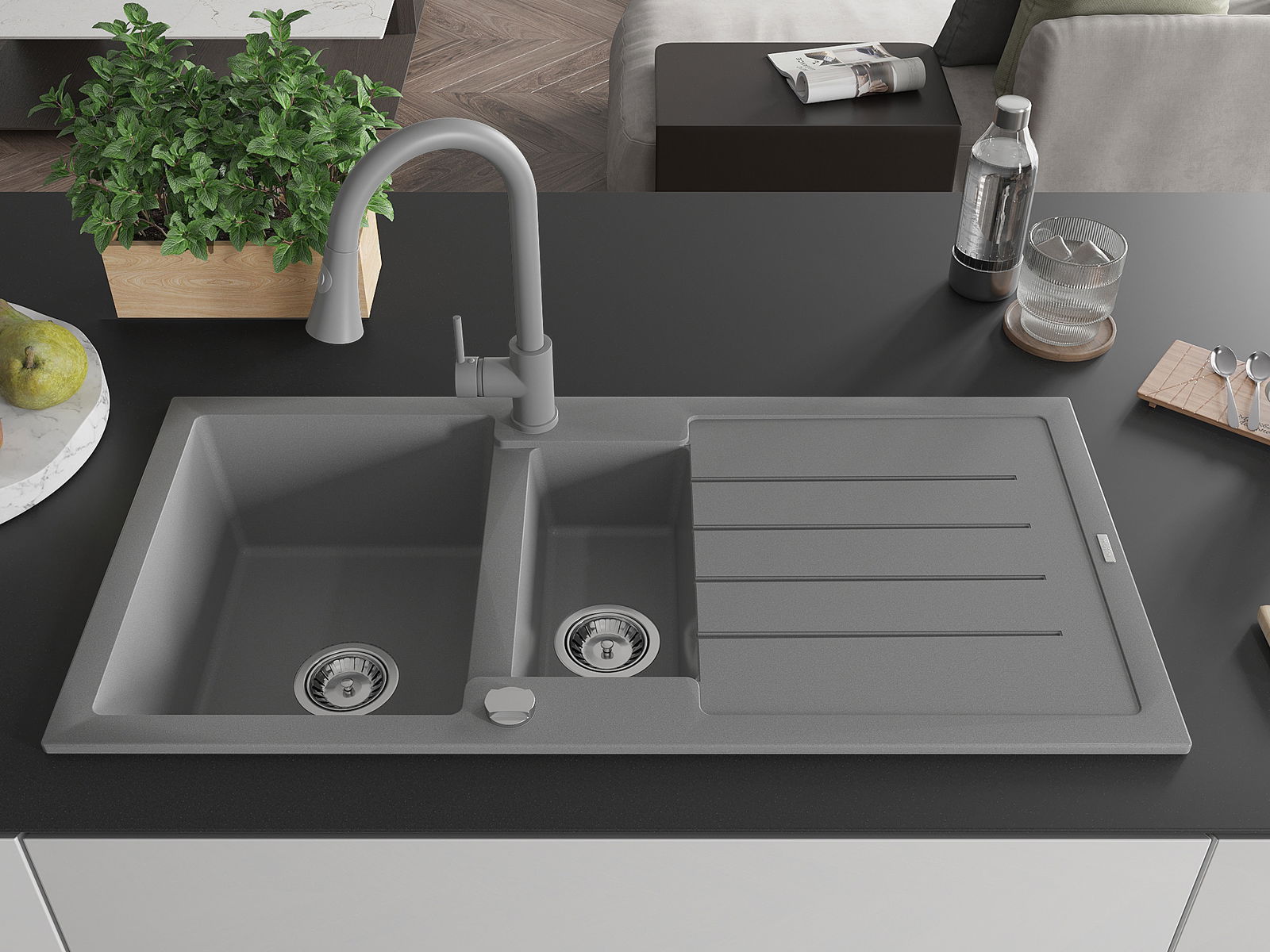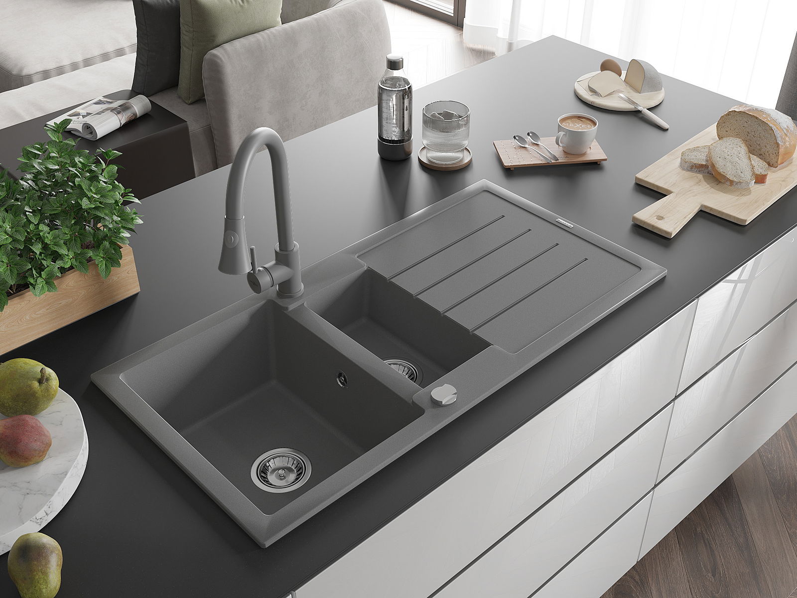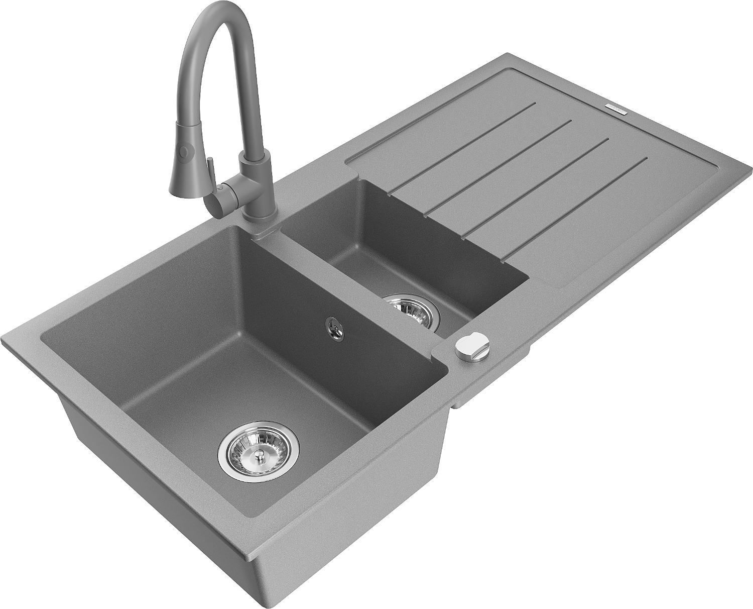 Mexen Andres гранитна кухненска мивка 1,5-камерна с отцедник и кухненски смесител Elia, сив - 6515-71-670101-71