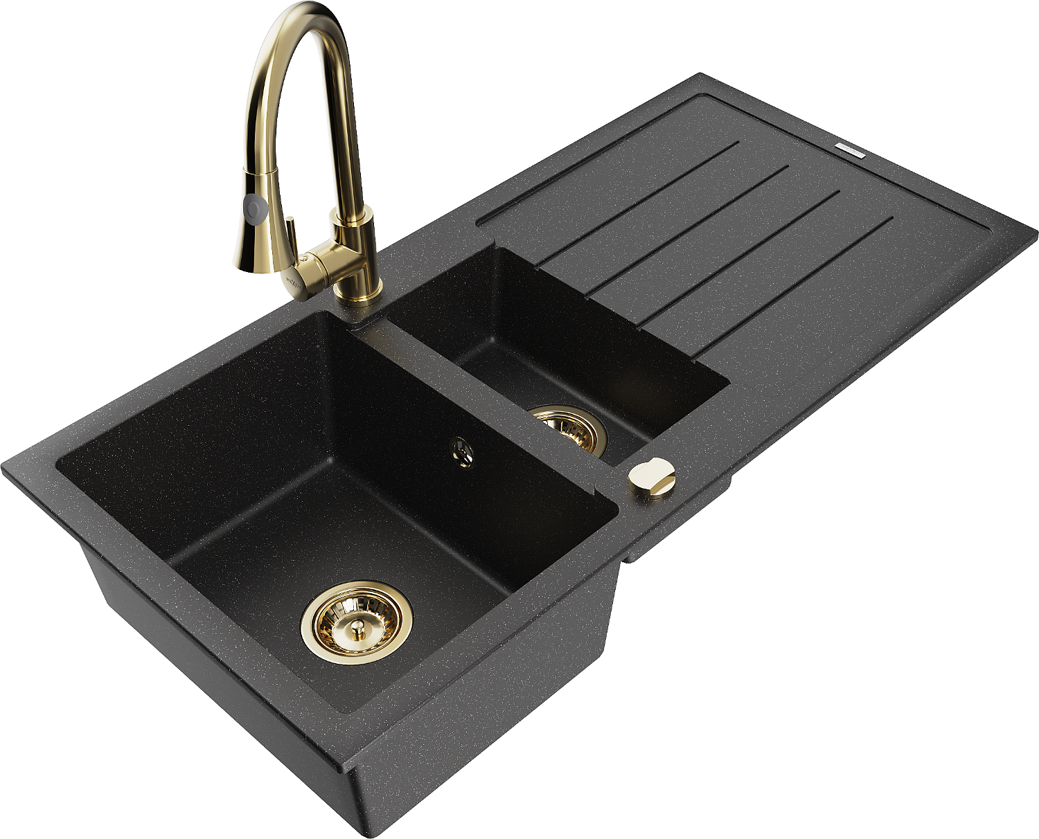 Mexen Andres гранитна мивка с 1,5 отделения, със сушилник и кухненска батерия Elia, черен/сребрист металик - 6515-73-670101-50