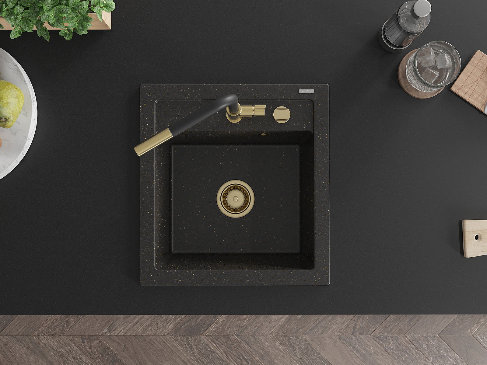 Mexen Vito гранитна мивка с 1 корито и кухненски смесител Flora, черен/златист металик - 6503-75-670401-57-G