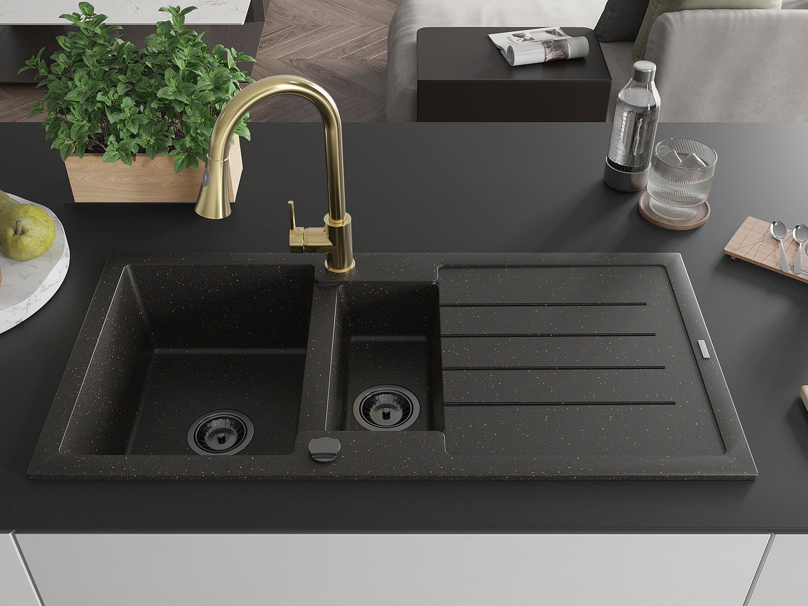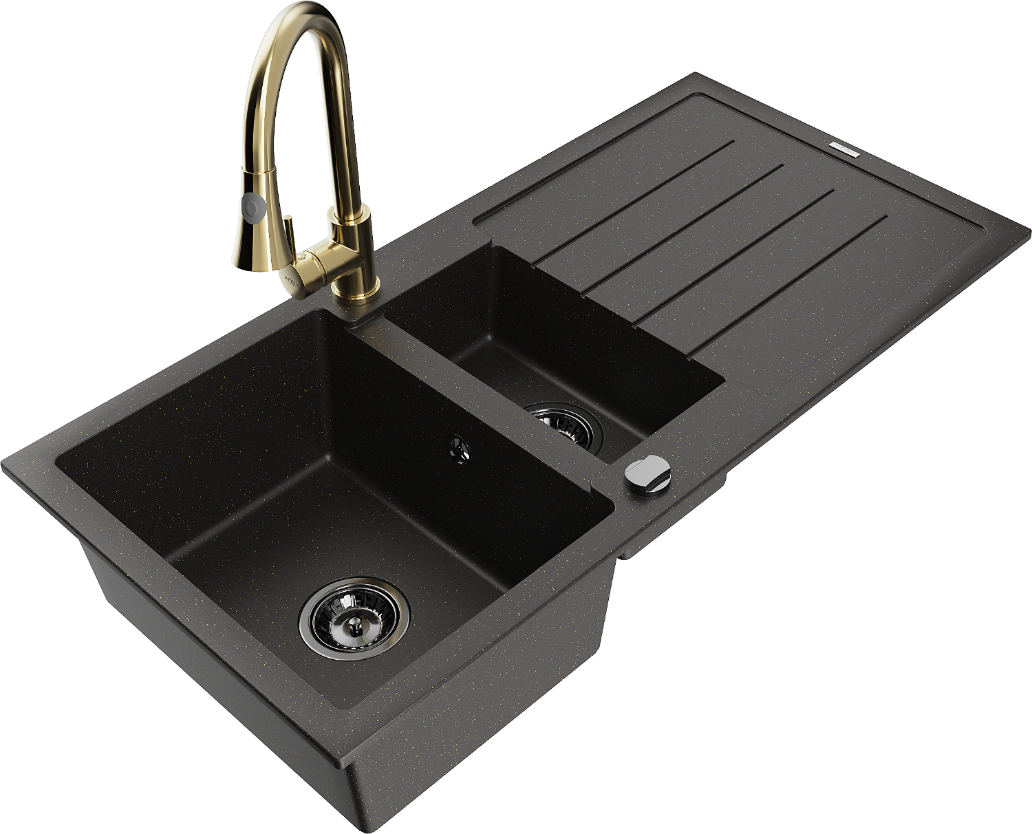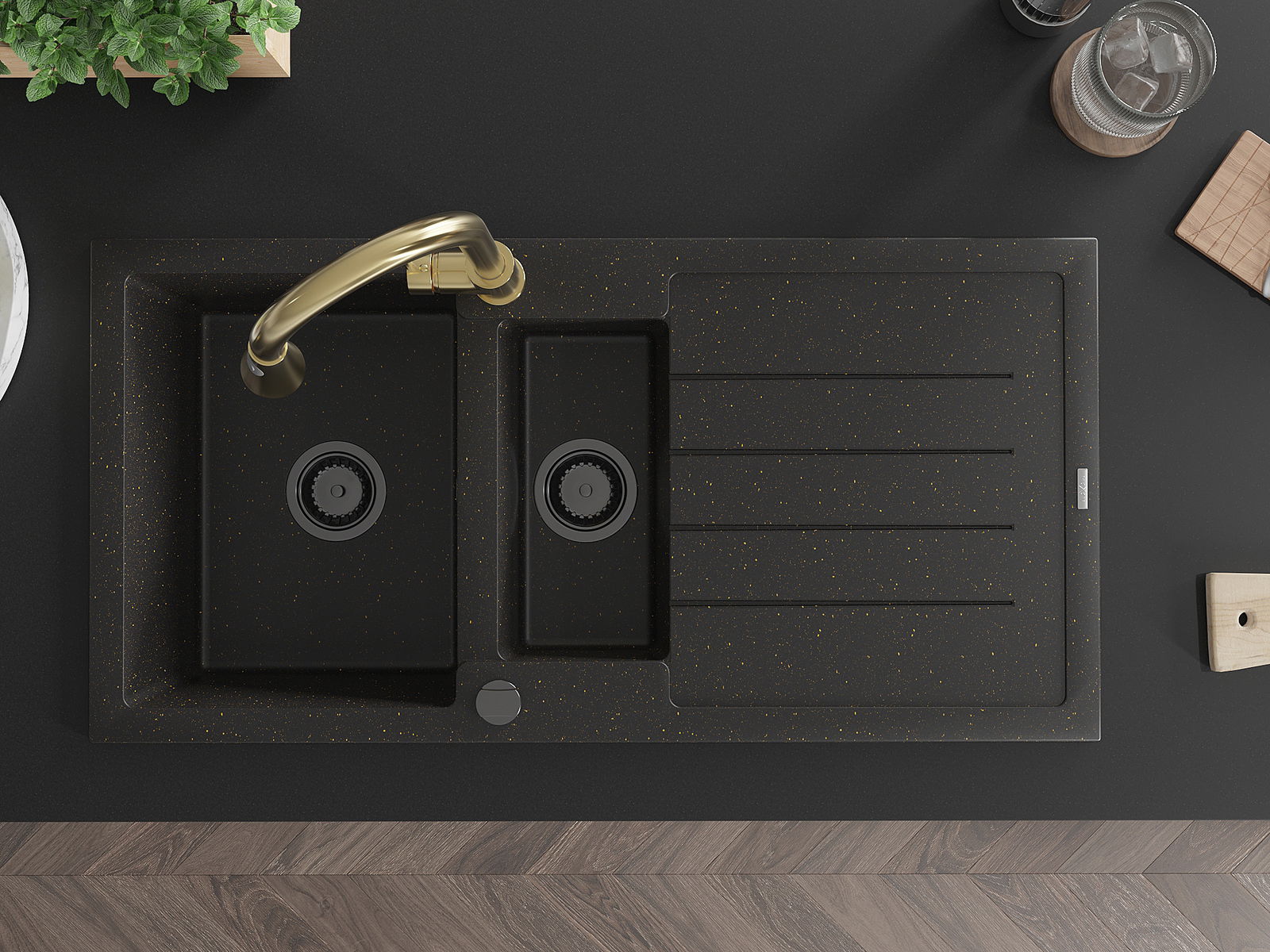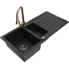 Mexen Andres гранитна мивка с 1,5 камери с отцедник и кухненски смесител Elia, черно/златно металик - 6515-75-670101-50-B