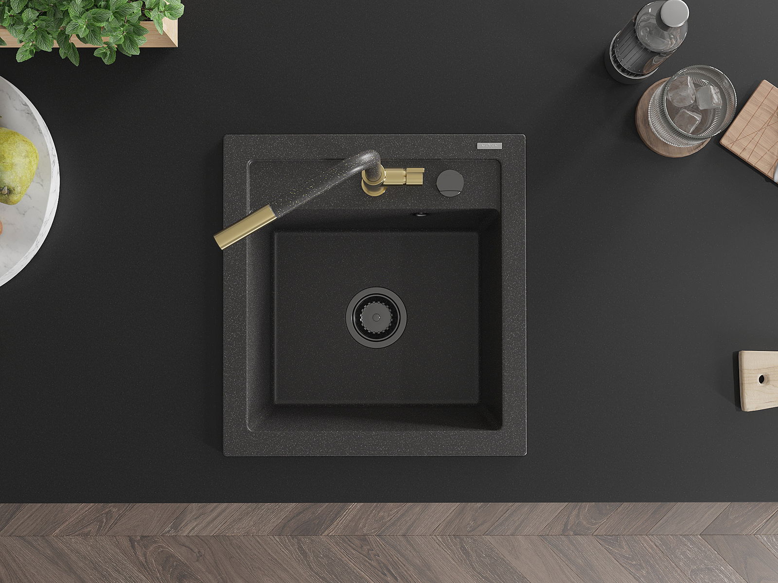 Мивката има показан отвор с диаметър 35 mm за самостоятелно. Може да се използва, наред с други За монтиране на течен дозатор, който ще премахне наличието на пластмасови бутилки в кухнята и ще му даде елегантен завършек.