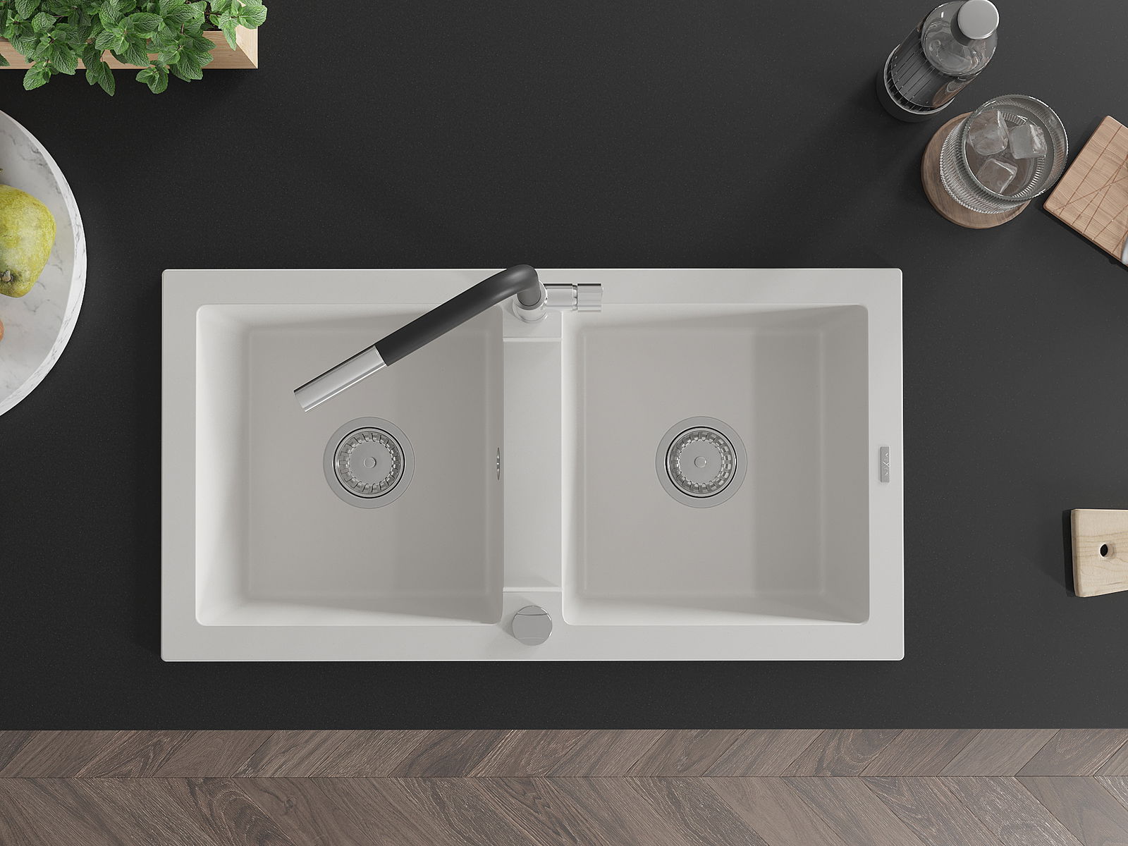 Mexen Mario гранитна мивка с 2 камери и кухненски смесител Flora, бял - 6504-20-670401-07