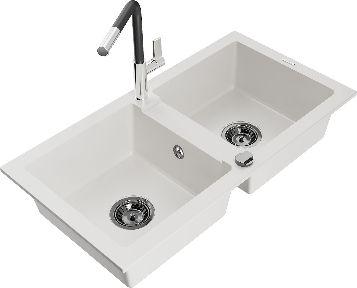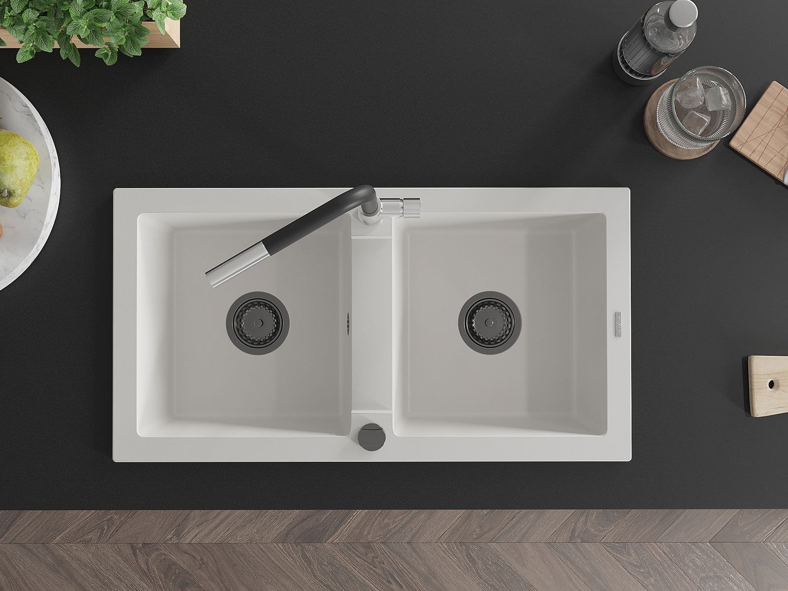 Mexen Mario гранитна мивка с 2 отделения и кухненски смесител Flora, бял - 6504-20-670401-07-B