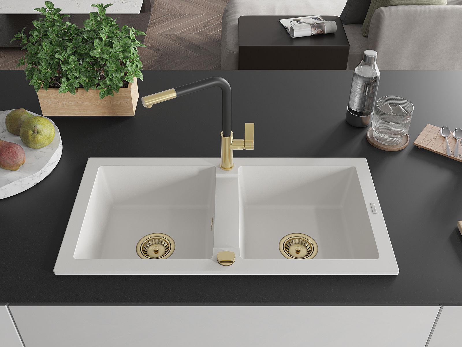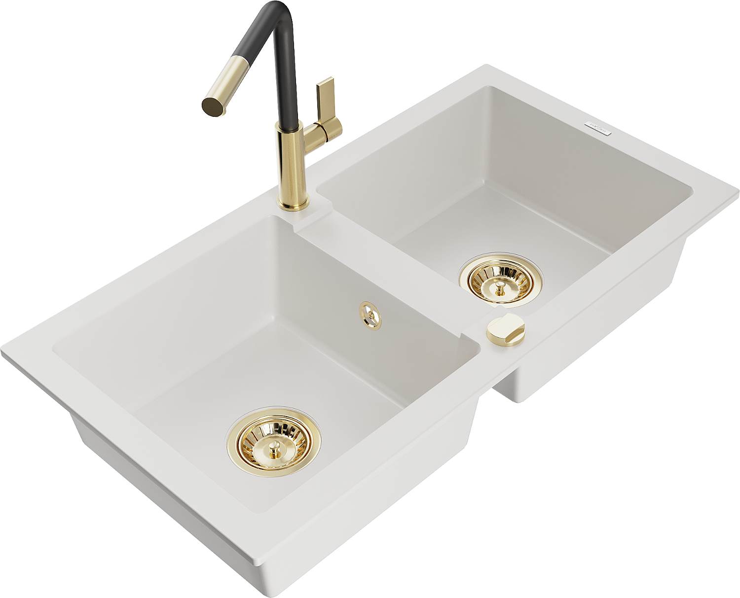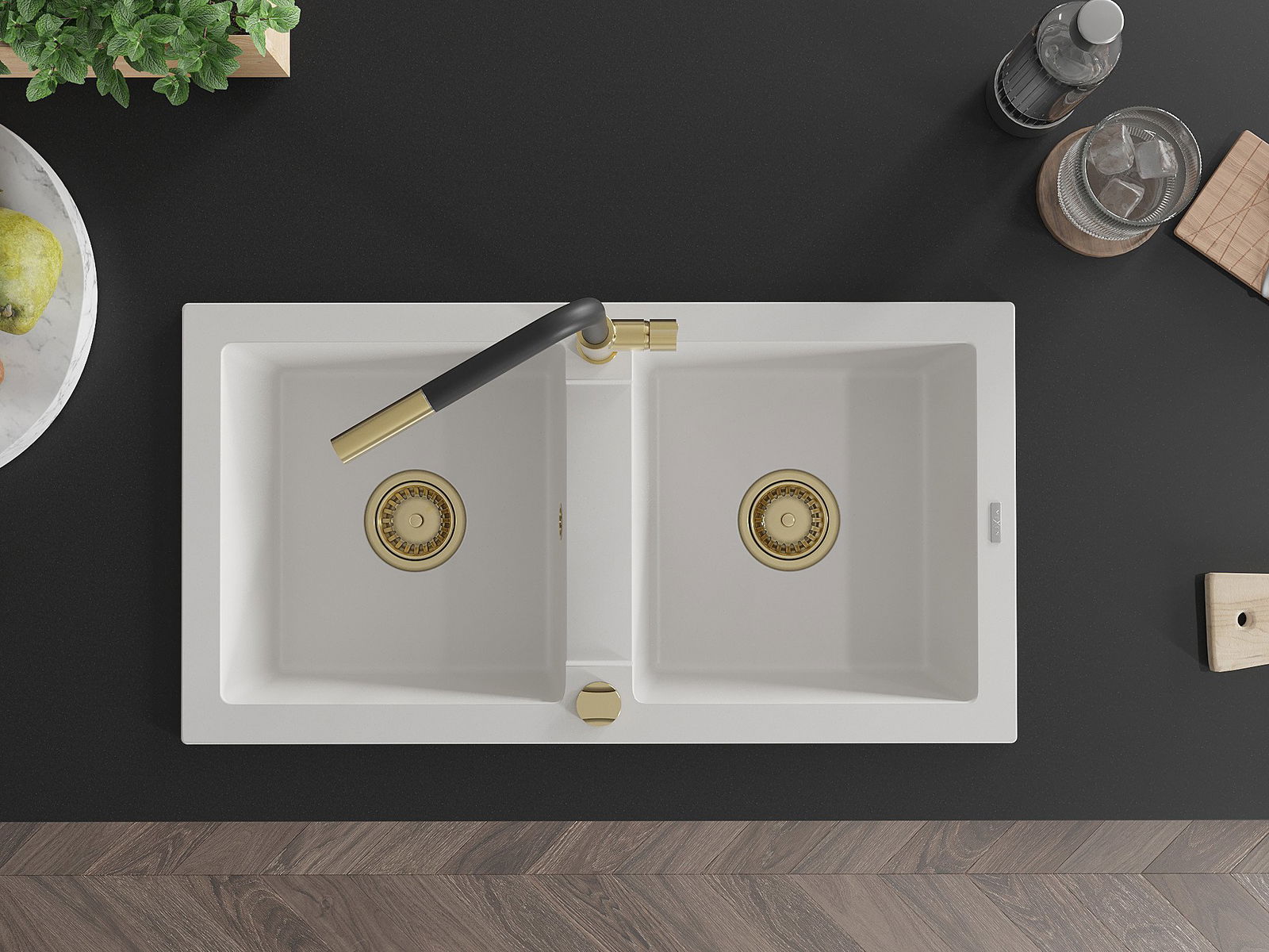 Mexen Mario гранитна мивка с 2 отделения с кухненски смесител Flora, бял