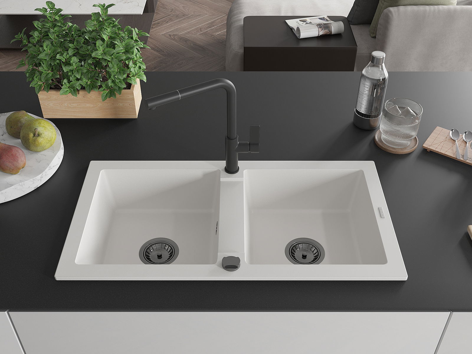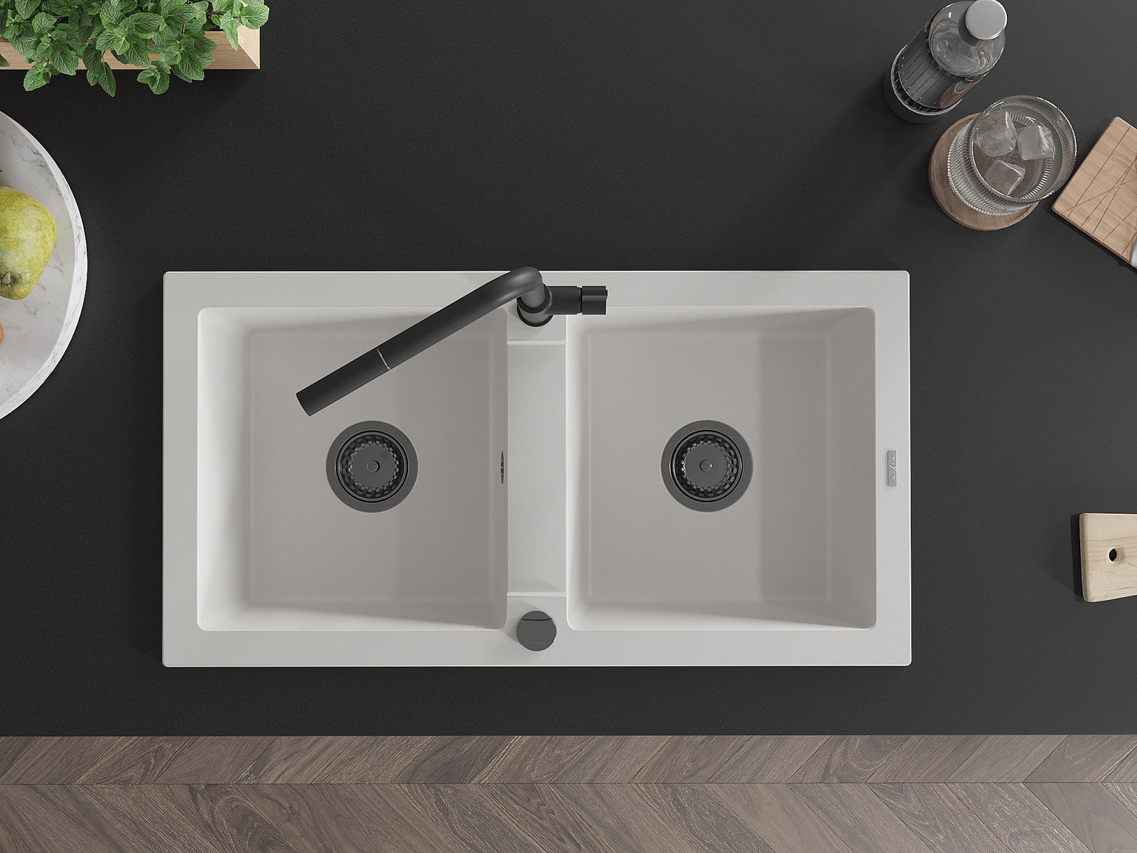 Mexen Mario Гранитна мивка с 2 камери и кухненски смесител Flora, бяла - 6504-20-670401-70-B