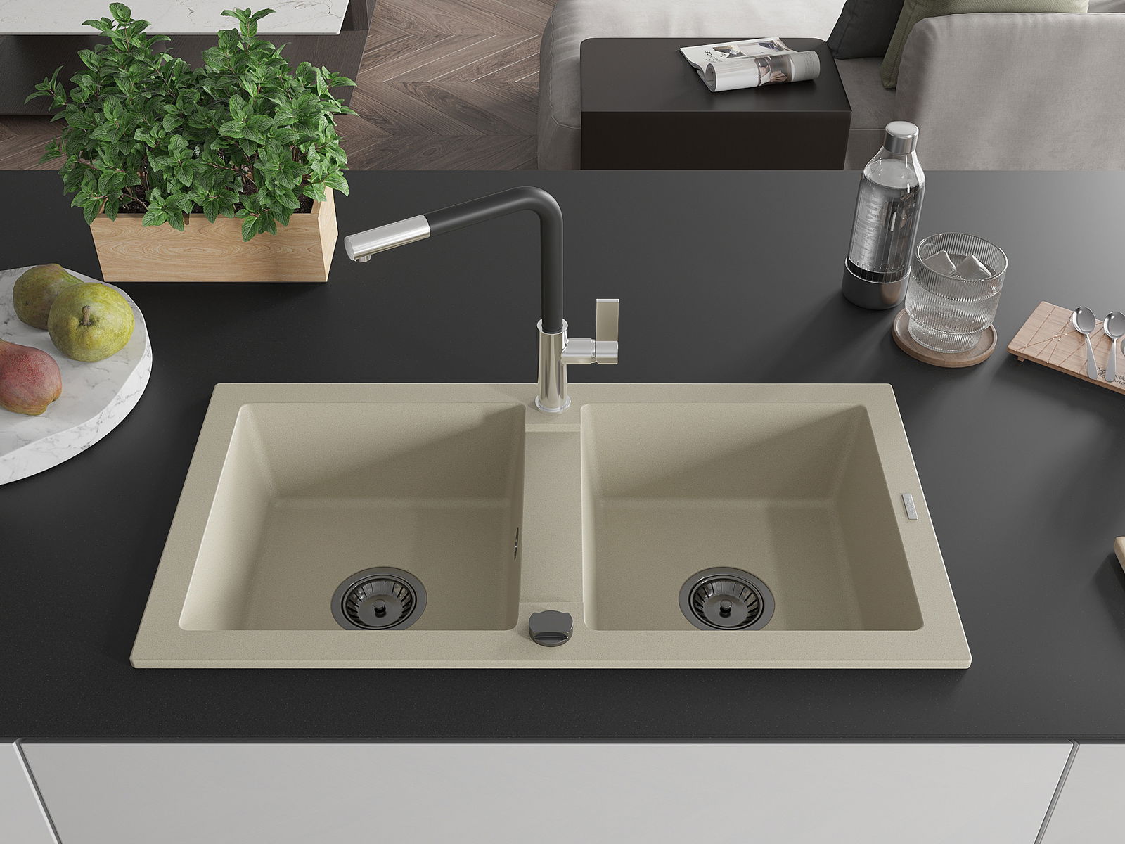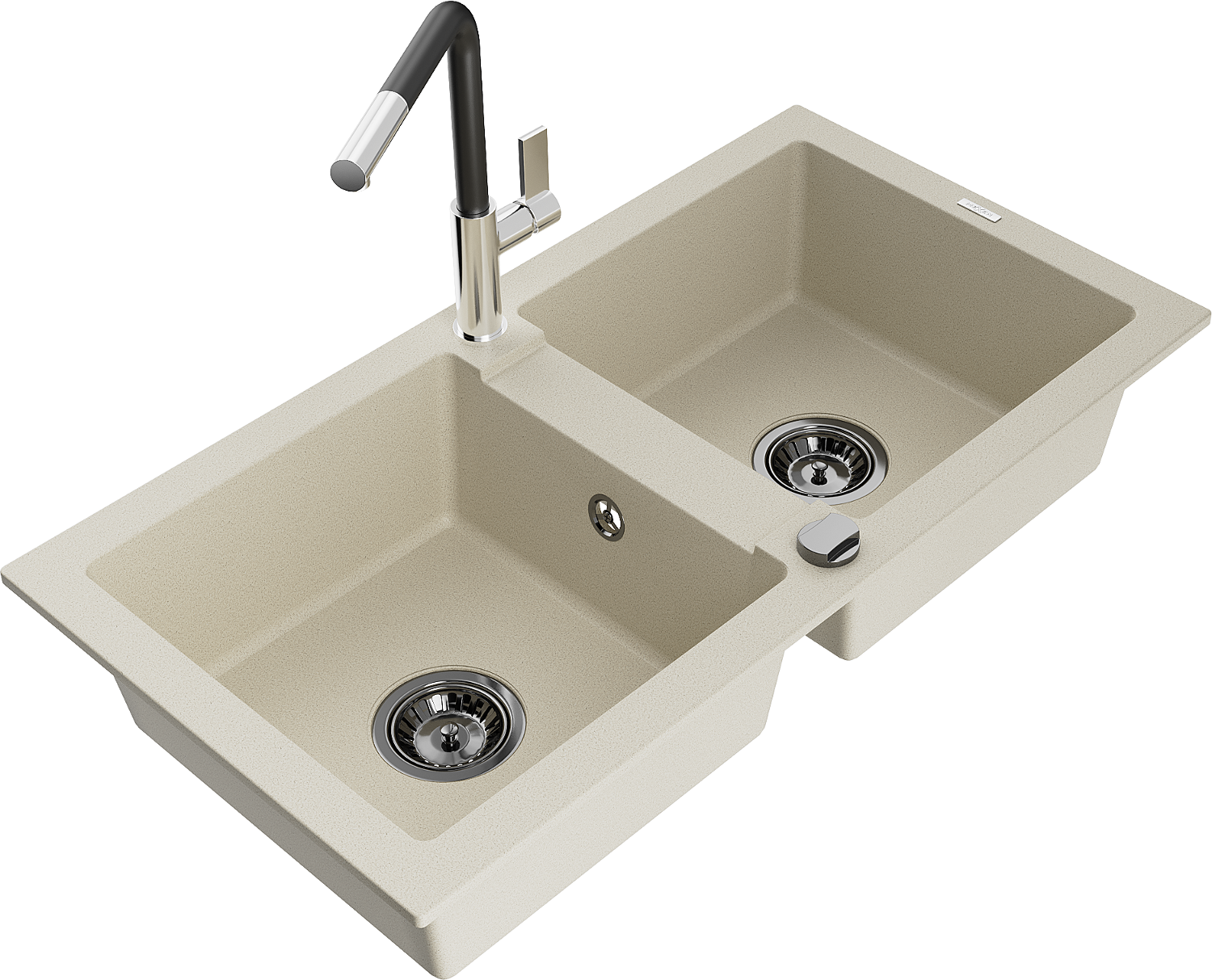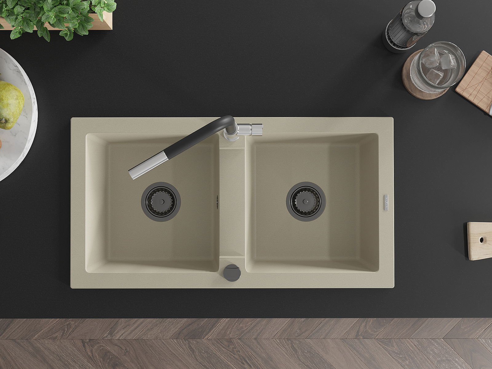 Mexen Mario двоен кухненски мивка с батерия Flora, бежов - 6504-69-670401-07-B