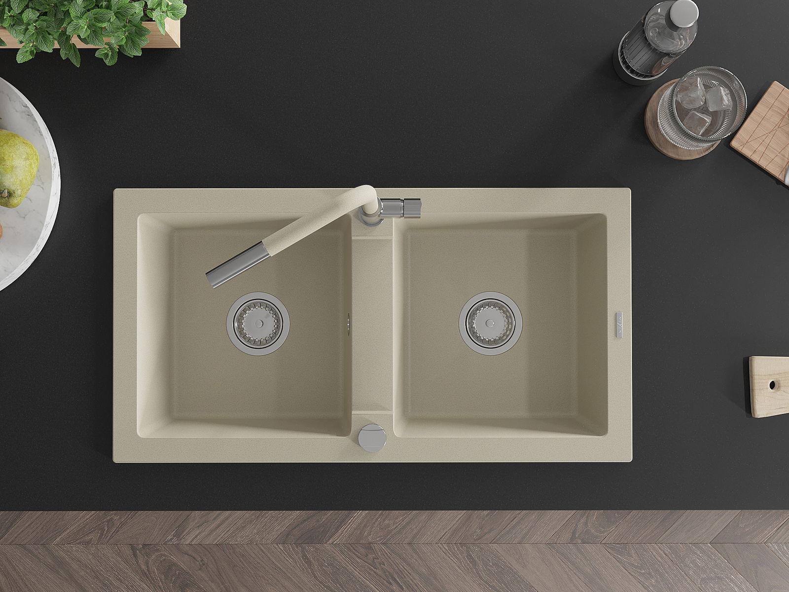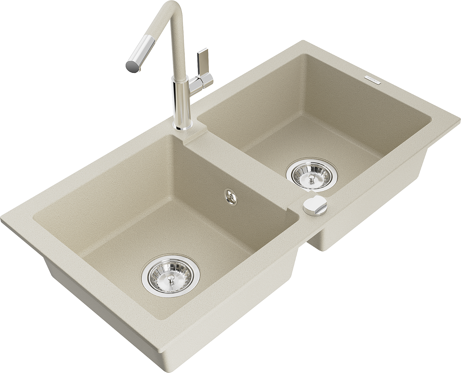 Mexen Mario гранитна двуканална кухненска мивка с батерия Flora, бежова - 6504-69-670401-09