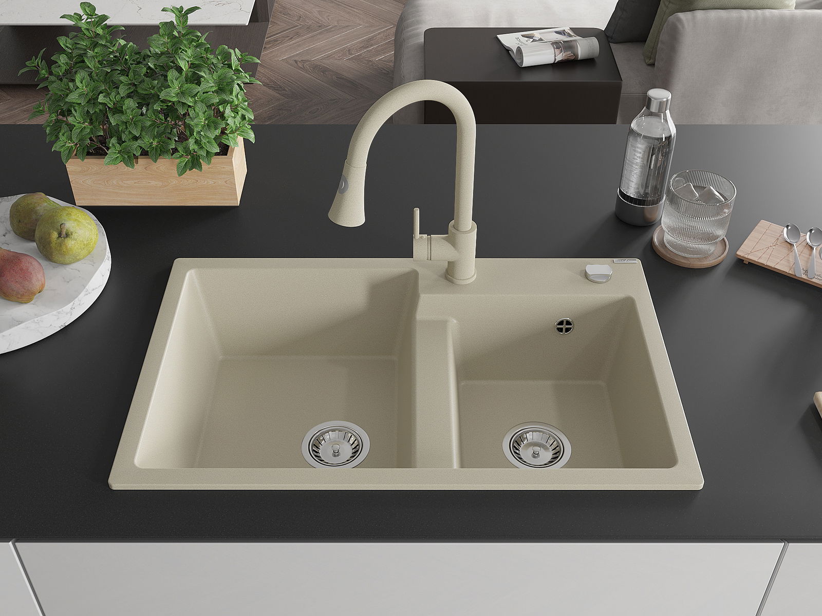 Mexen Tomas гранитна мивка с 2 отделения и кухненски смесител Elia, бежов - 6516-69-670101-69