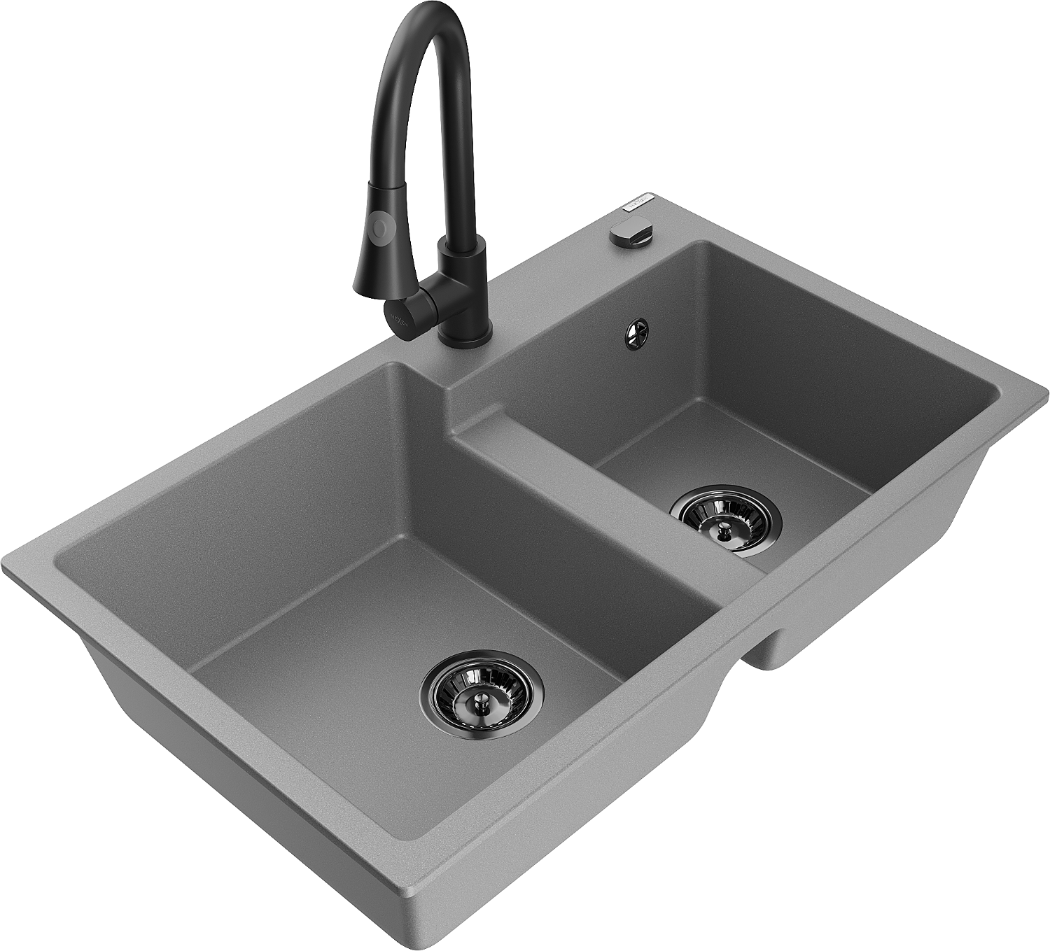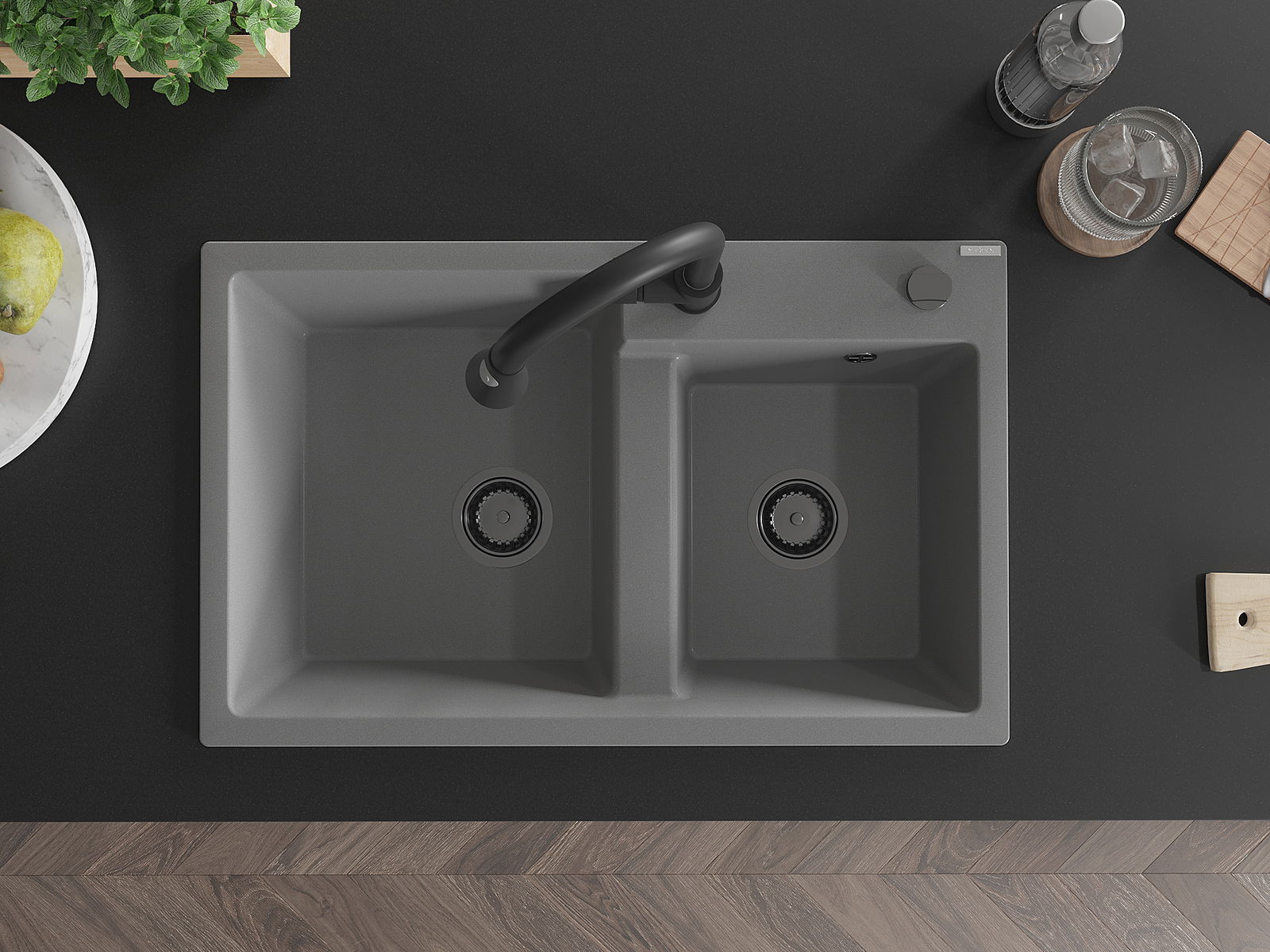 Mexen Tomas гранитна мивка с 2 отделения и кухненски смесител Elia, сиво - 6516-71-670101-70-B