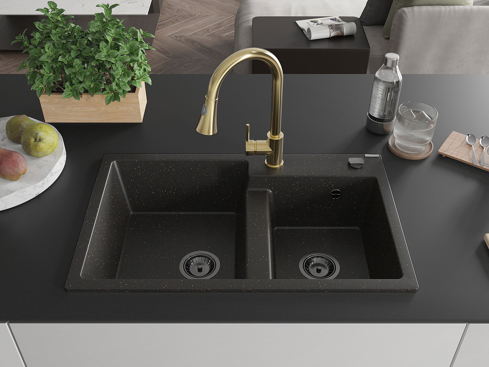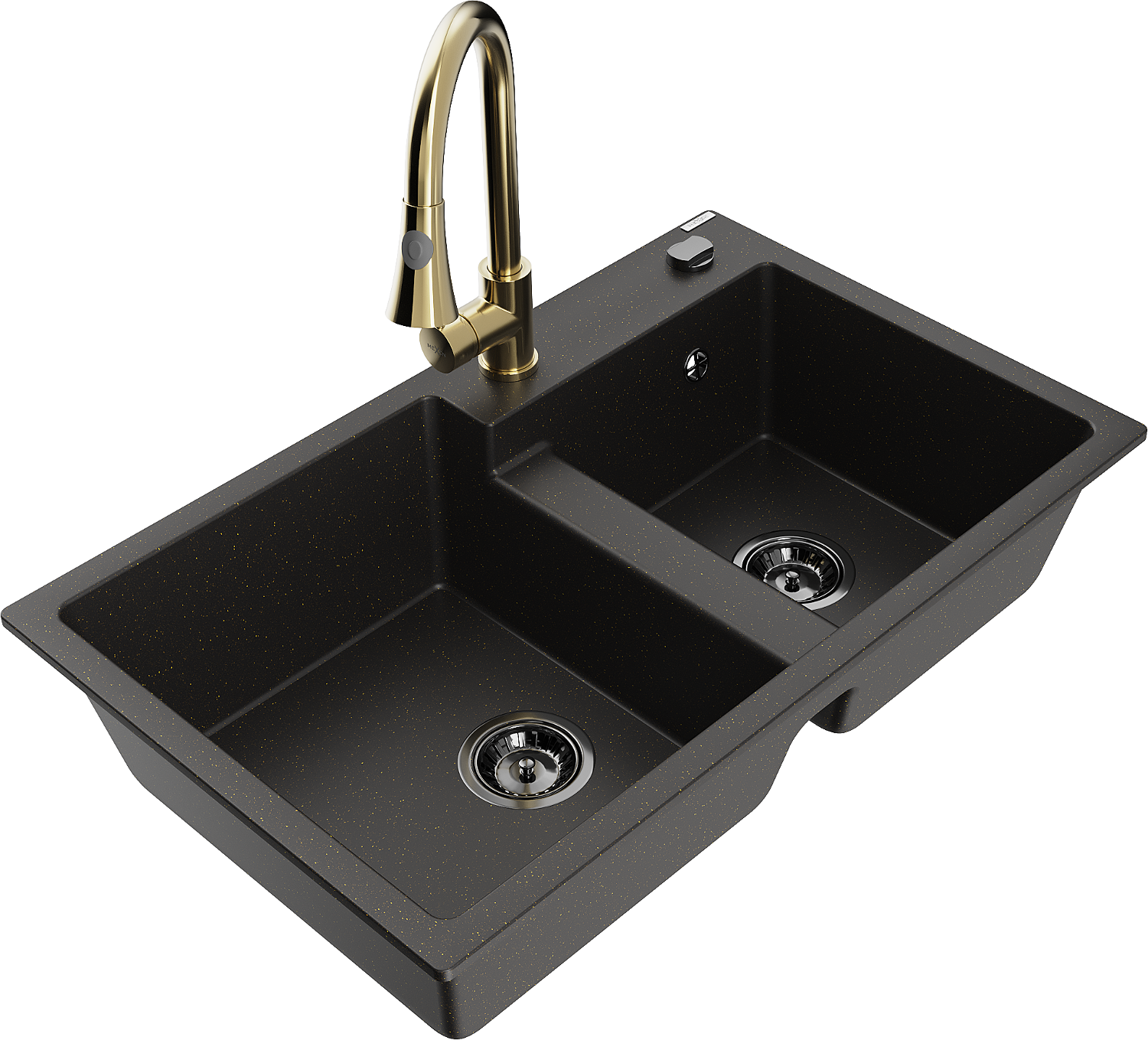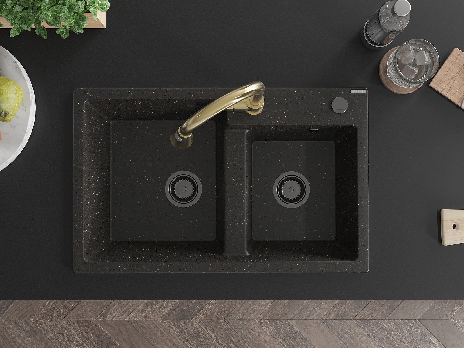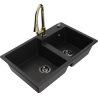 Mexen Tomas гранитна мивка с двоен басейн и кухненски смесител Elia, черен/златен металик - 6516-75-670101-50-B