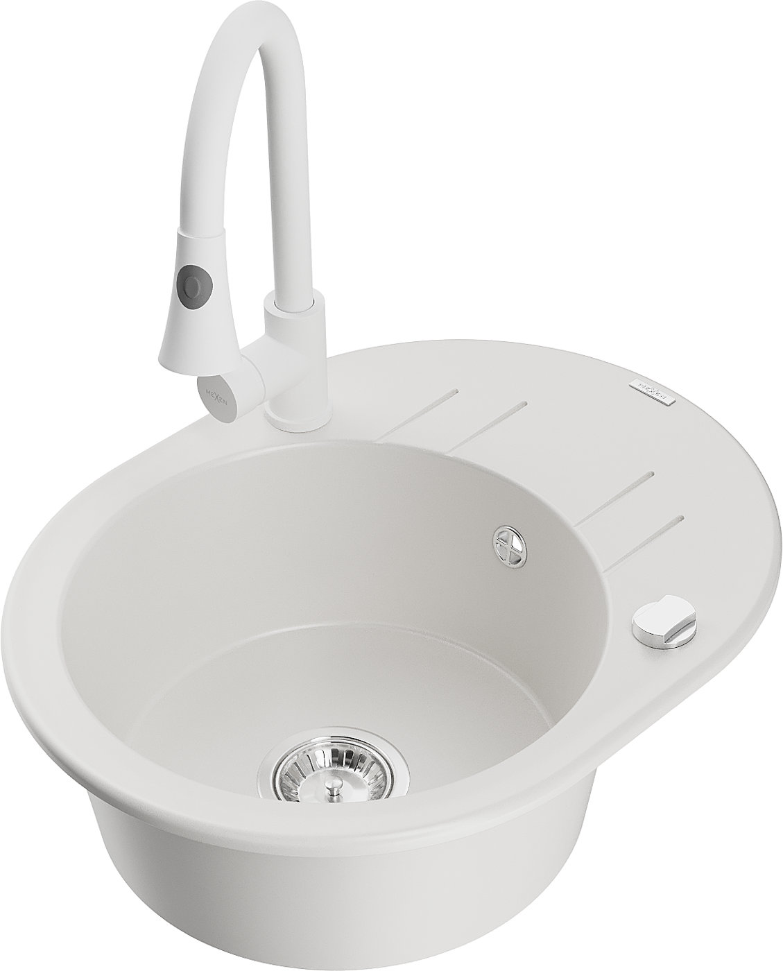 Mexen Kevin гранитна мивка с 1 камера и отцедник и кухненски смесител Elia, бял - 6517-20-670101-20
