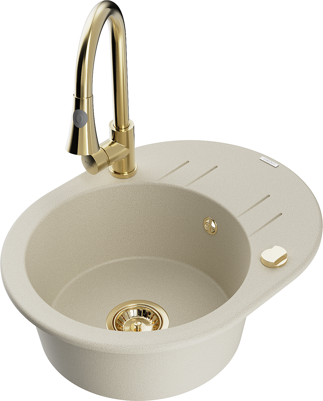 Mexen Kevin гранитна кухненска мивка с 1 отделение и отцедник и кухненски смесител Elia, бежов - 6517-69-670101-50
