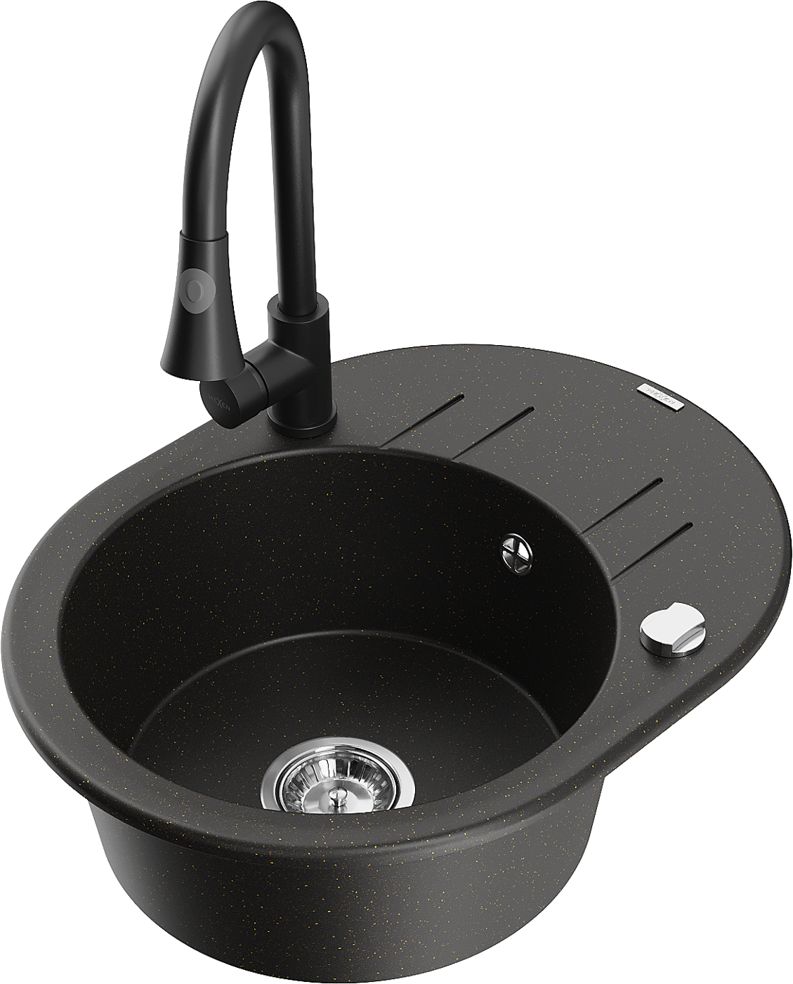 Mexen Kevin гранитна мивка с една камера с отцедник и кухненски смесител Elia, черен/златен металик - 6517-75-670101-70