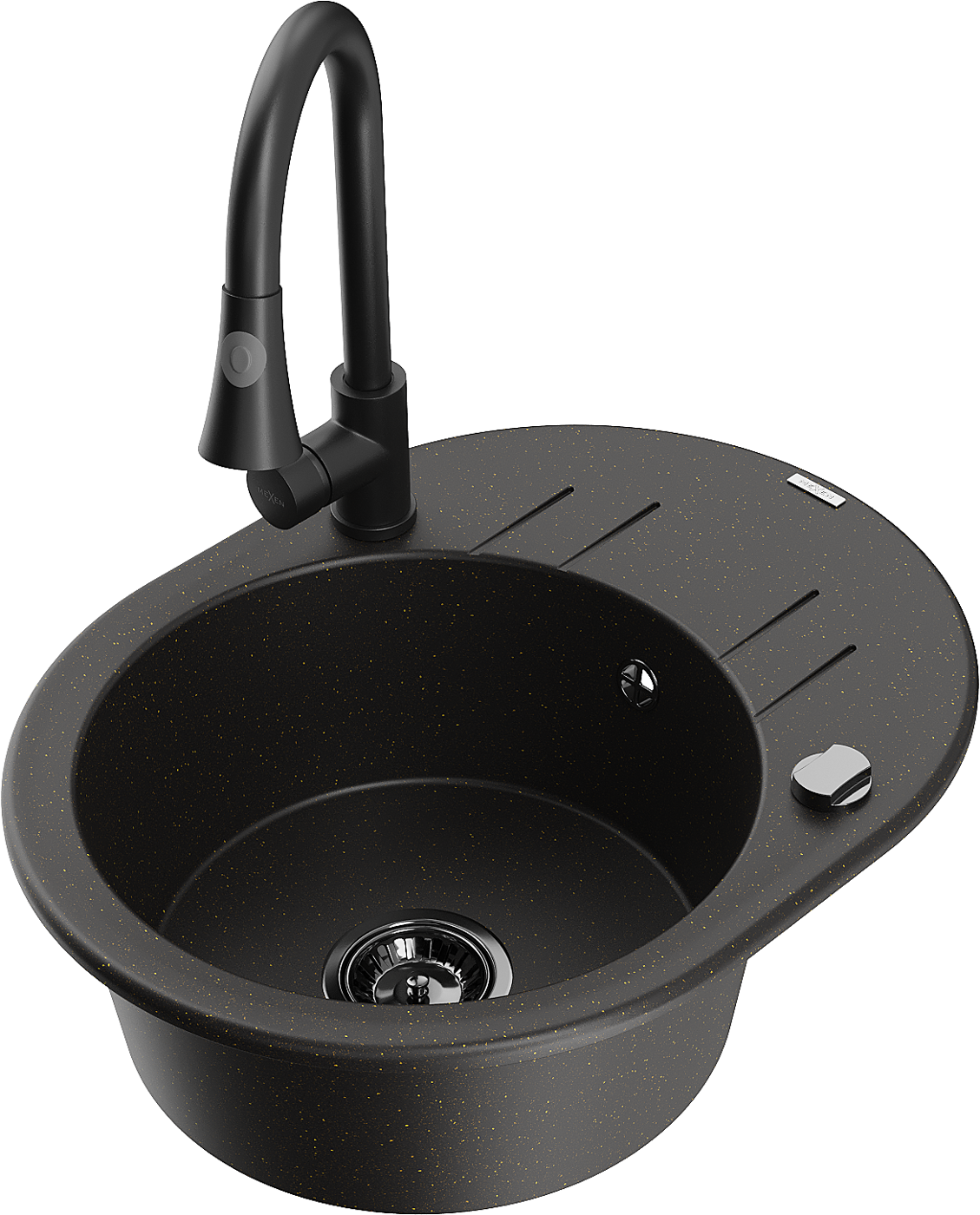 Mexen Kevin кухненска мивка от гранит с една камера с отцедник и кухненски смесител Elia, черно/златно металик - 6517-75-670101?