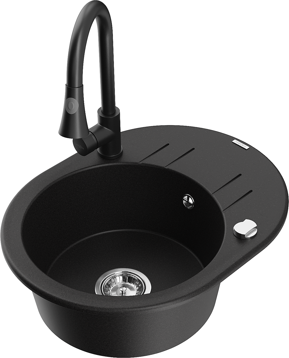 Mexen Kevin гранитна кухненска мивка с 1 корито с отцедник и кухненски смесител Elia, черен - 6517-77-670101-70
