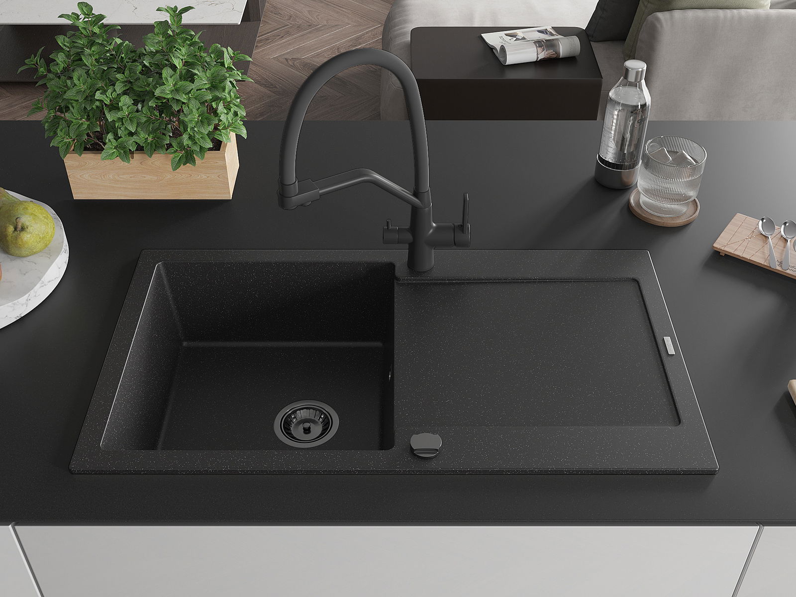 Мивката е направена от висококачествен гранит. Това е елегантно и най -вече практично допълнение към всяка кухня, независимо от нейния стил. Висококачествената и гранитна издръжливост осигуряват много години употреба.