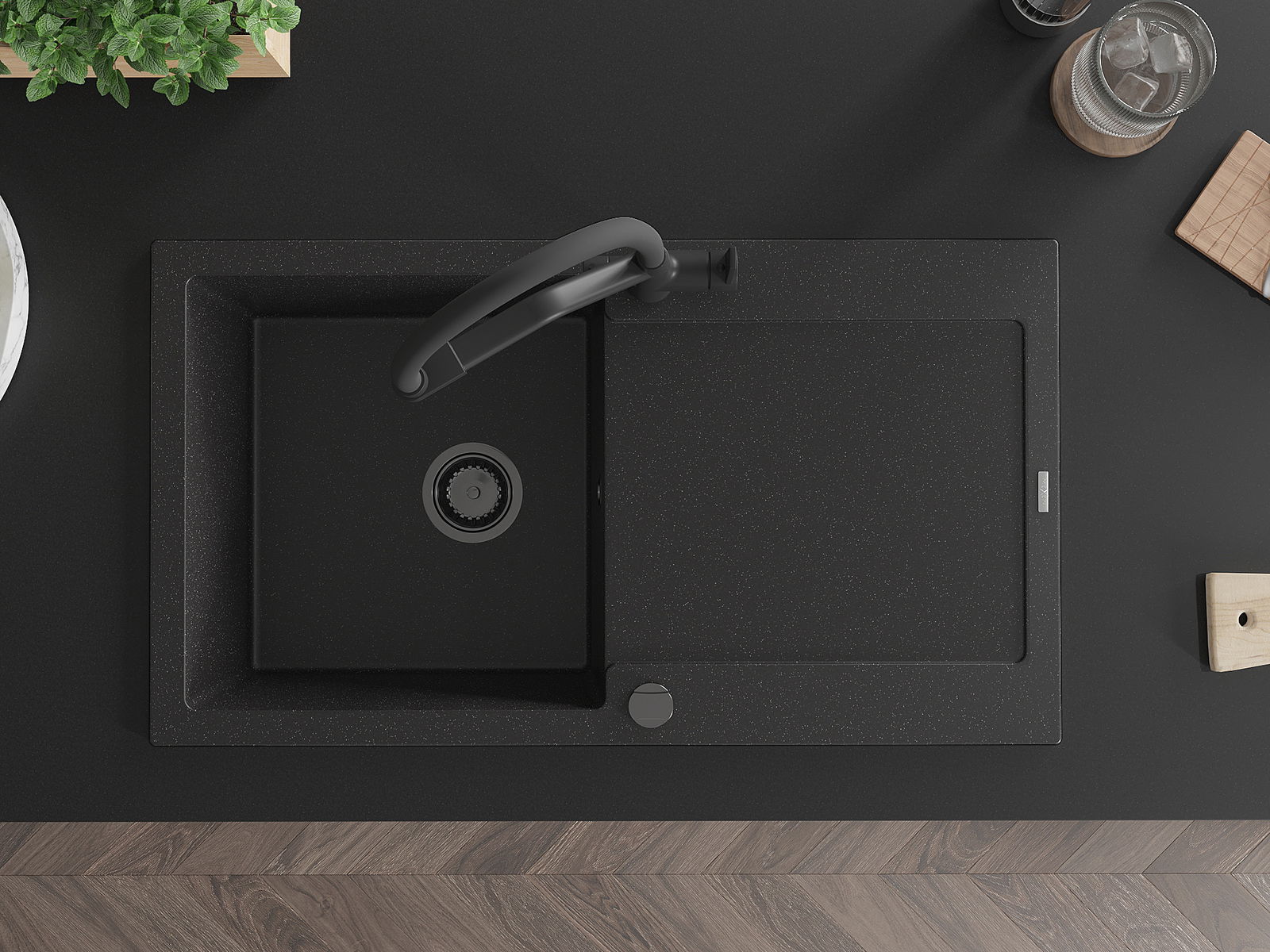 Mexen Leo гранитна мивка с 1 отделение, с отцеждач и кухненски смесител Duo, черен/сребрист металик - 6501-73-671701-70-B