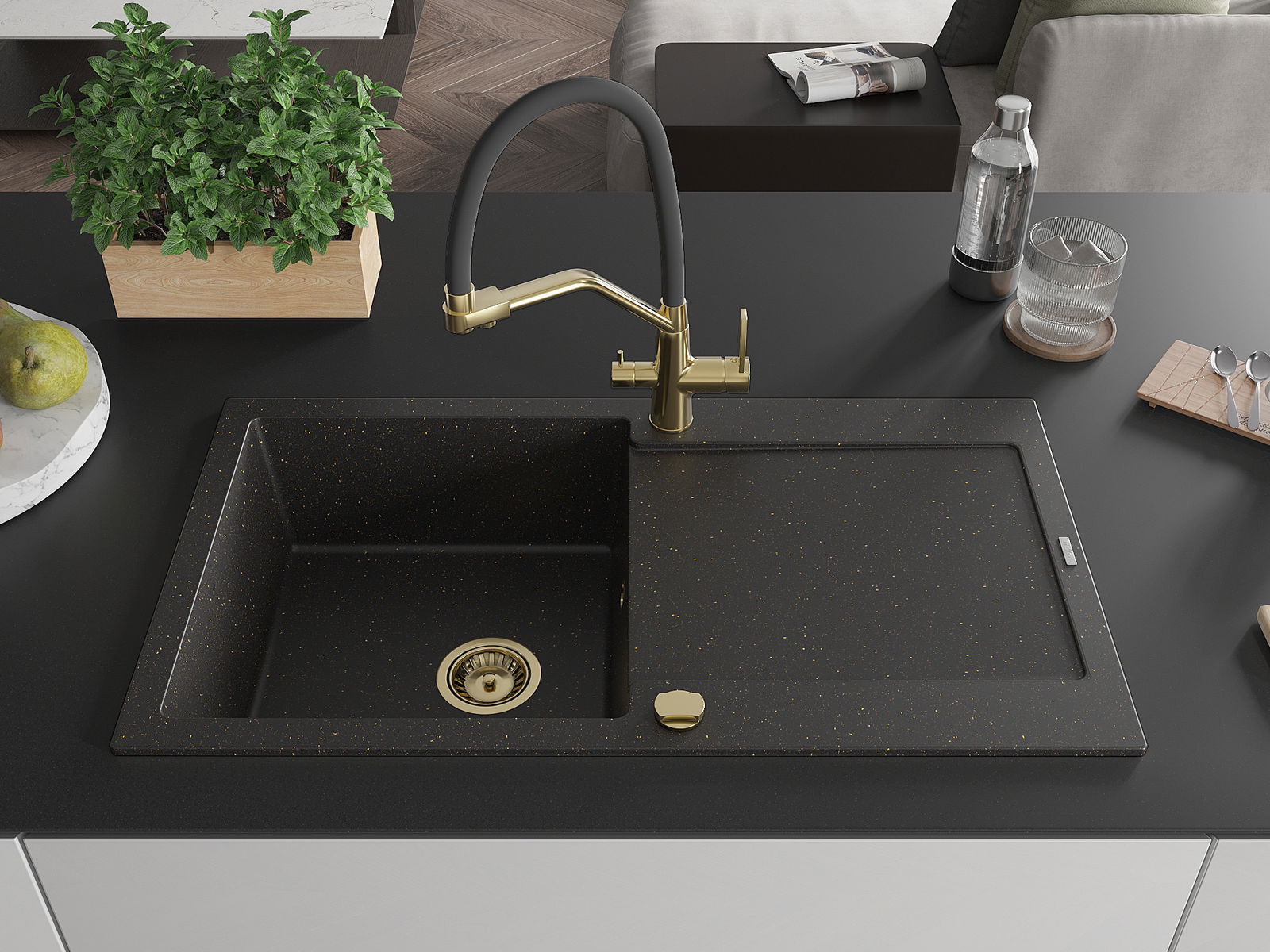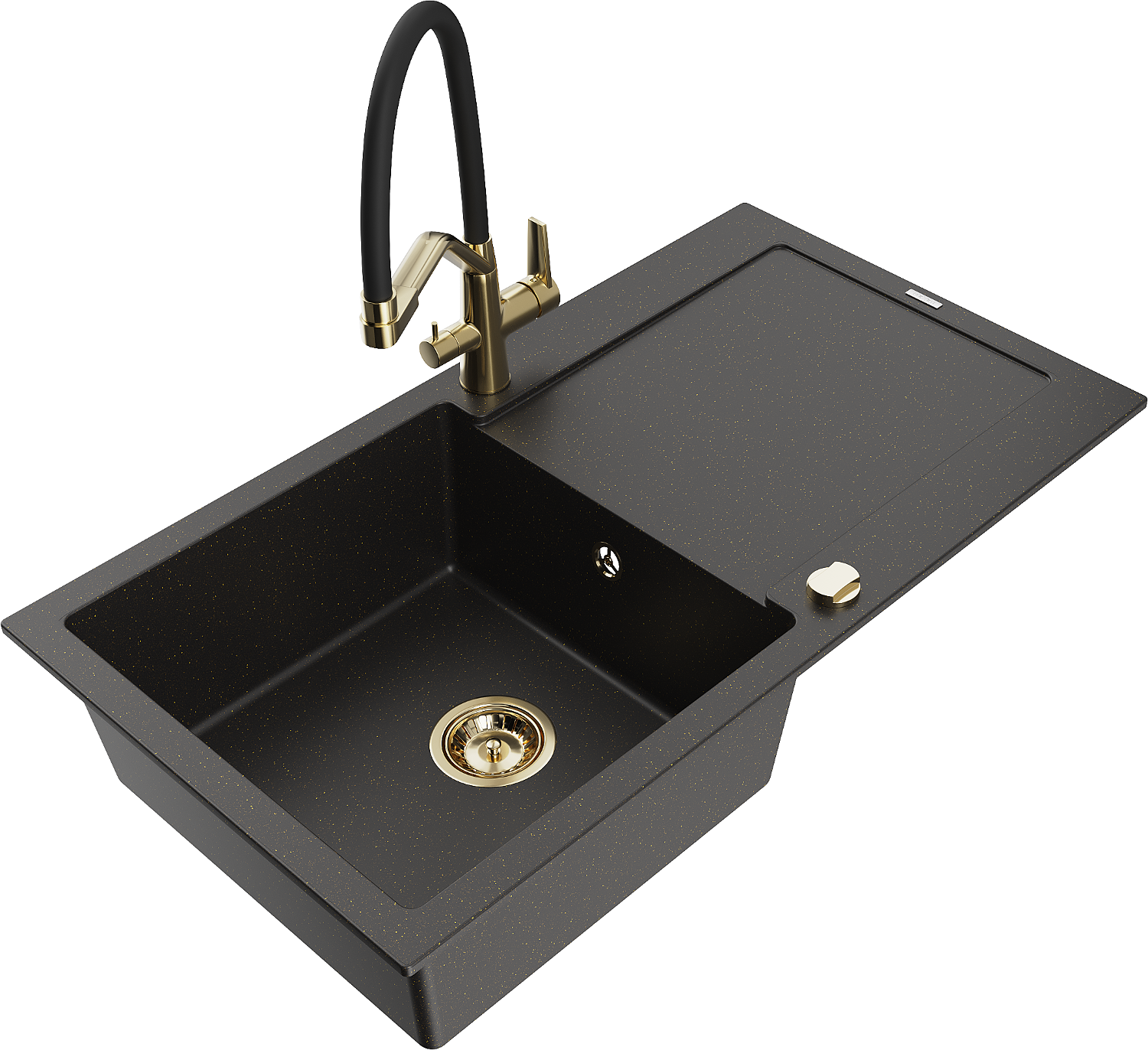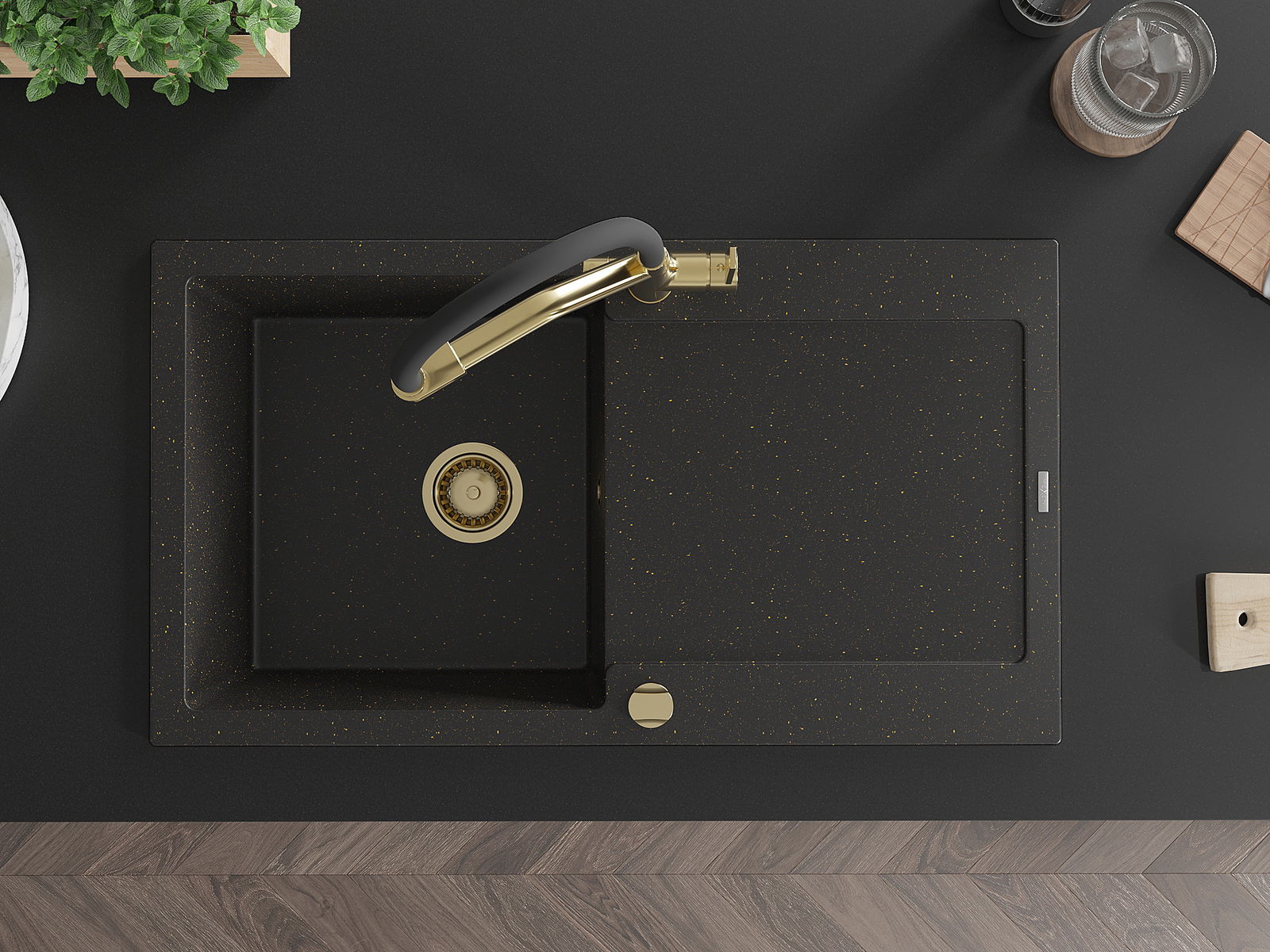 Mexen Leo гранитна мивка с 1 отделение и отцеждач и кухненски смесител Duo, черен/златен металик - 6501-75-671701-57-G