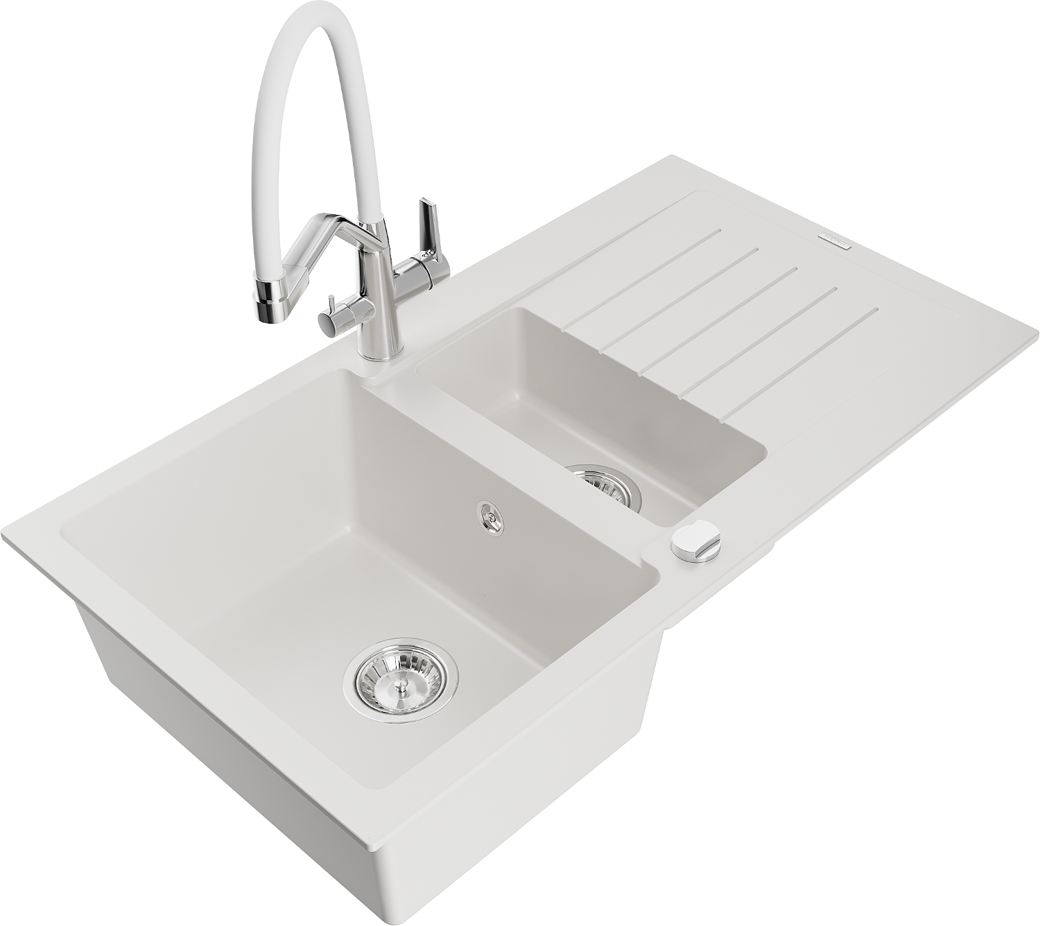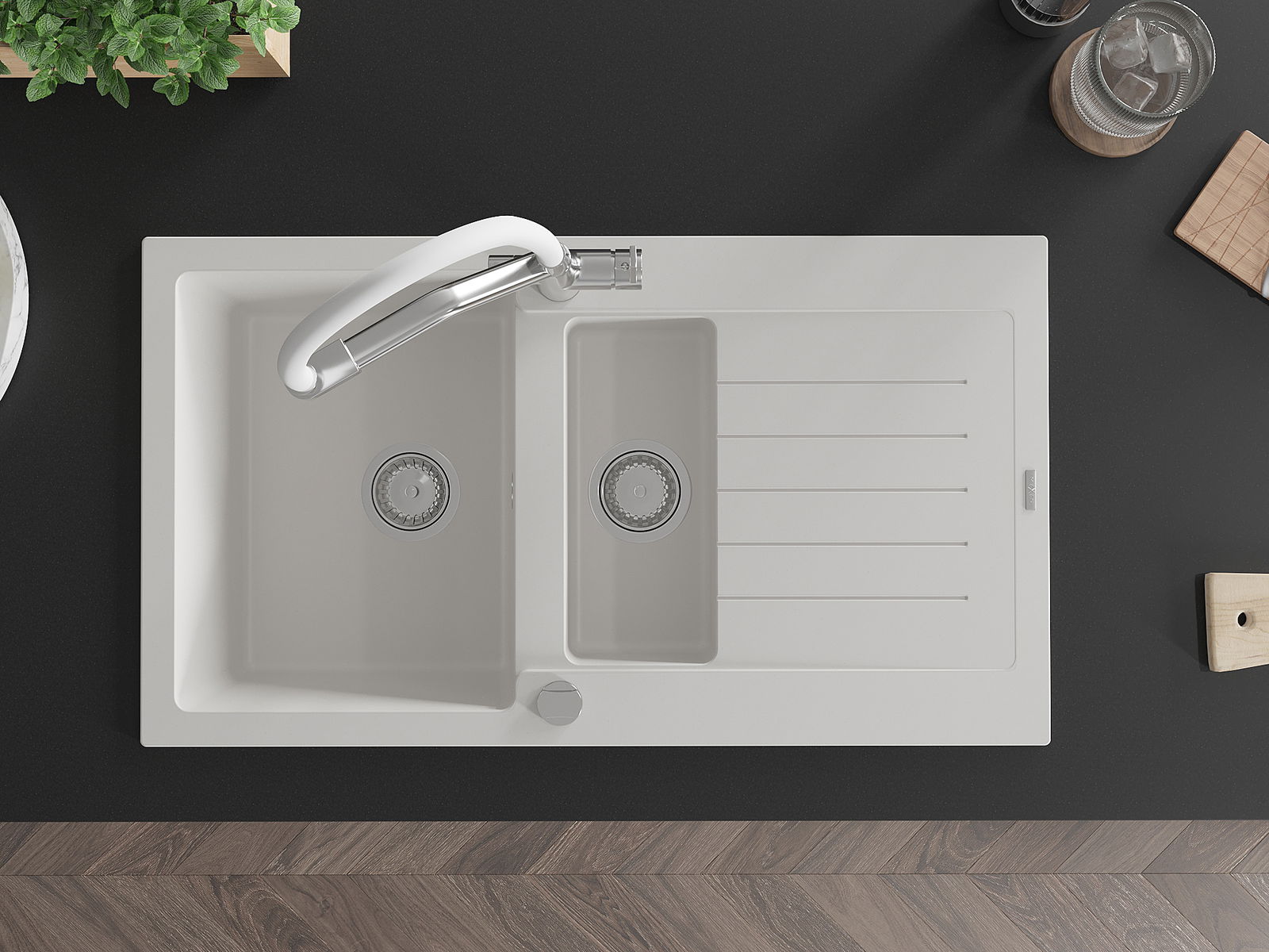 Mexen Matias гранитна мивка с 1,5 камери с отцедник и кухненски смесител Duo, бял - 6502-20-671701-02