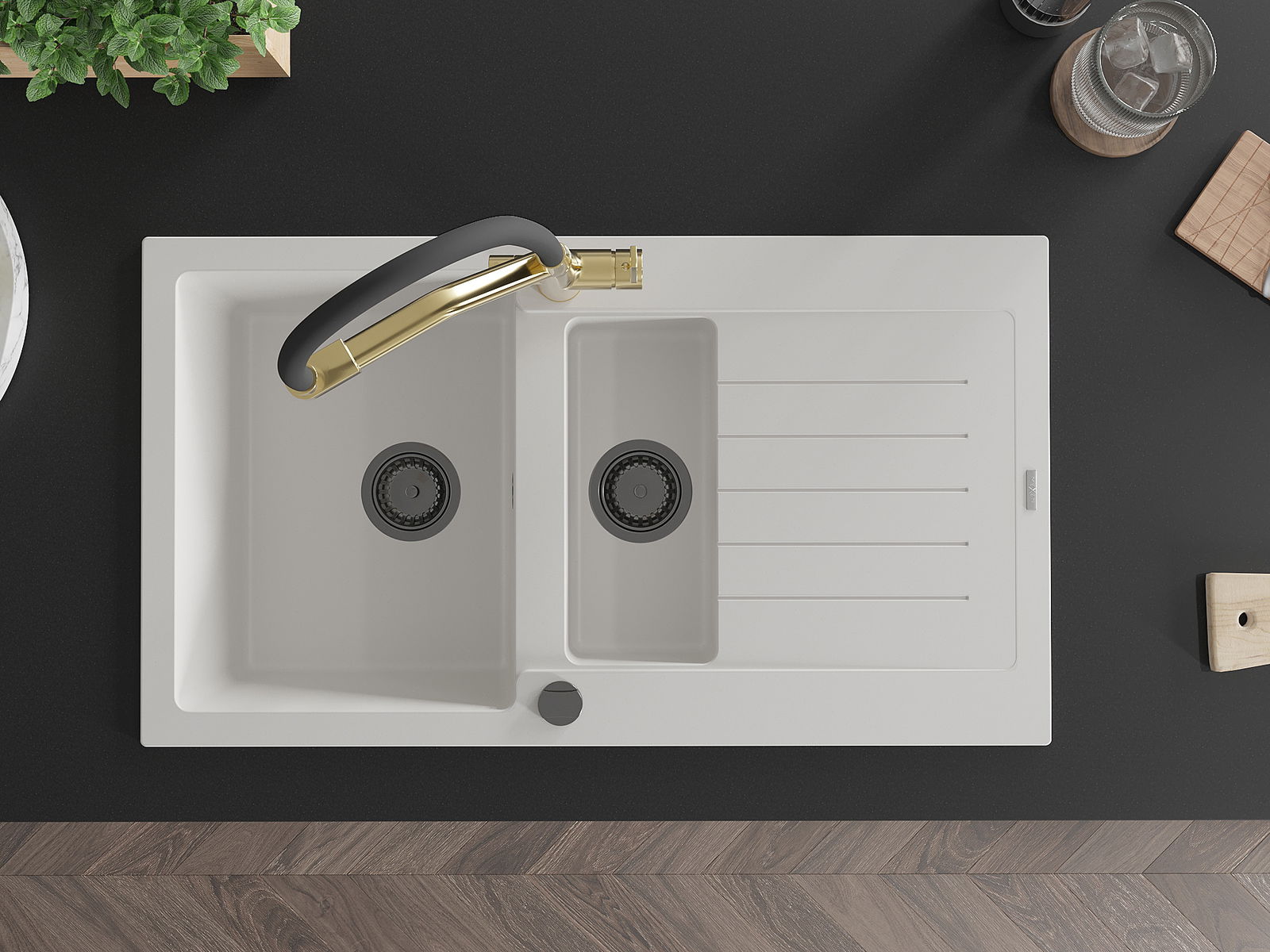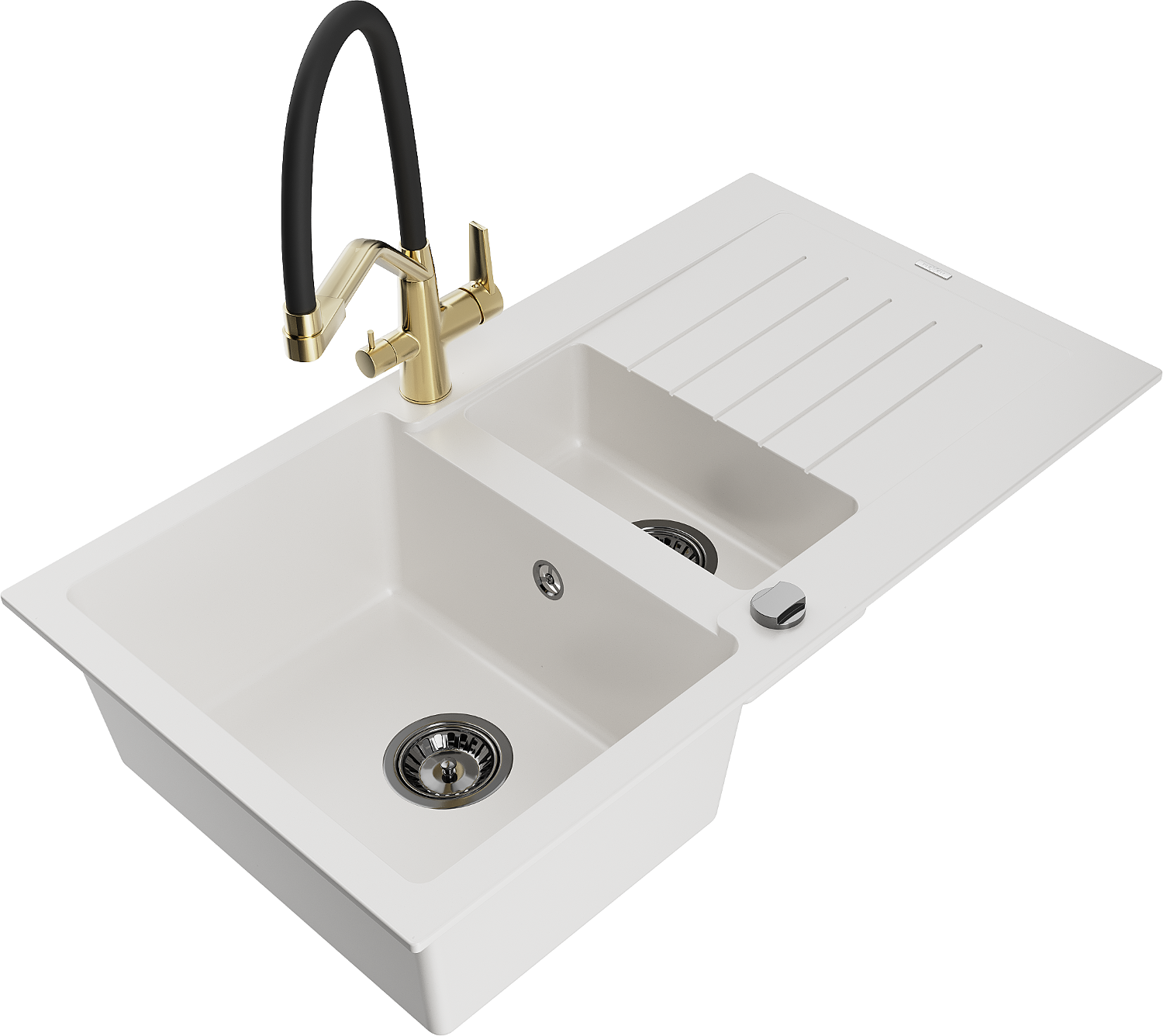 Mexen Matias гранитна мивка с 1,5 камери с отцедник и кухненски смесител Duo, бял - 6502-20-671701-57-B