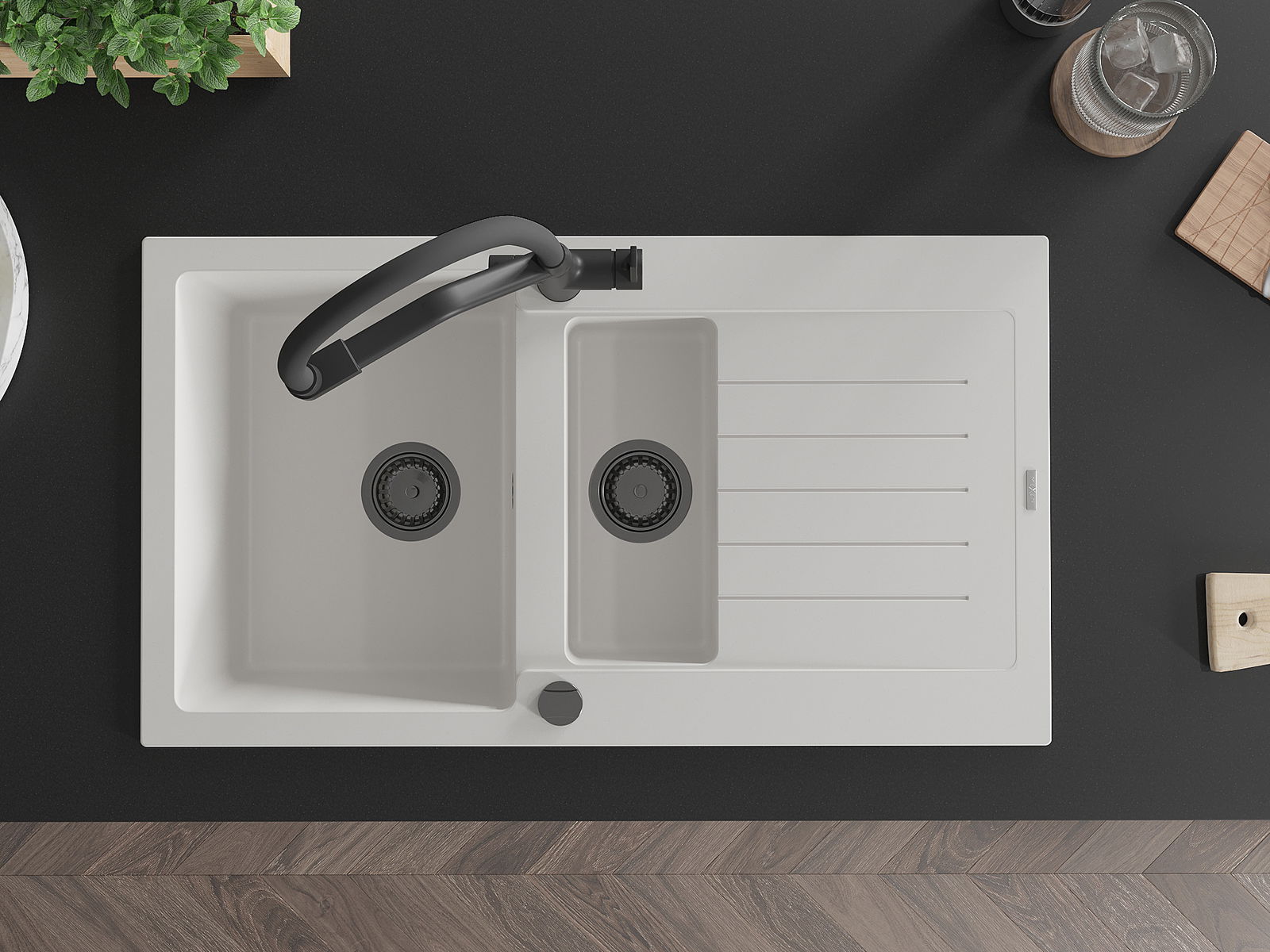 Mexen Matias гранитна мивка с 1,5 камери с отцедник и кухненски смесител Duo, бял - 6502-20-671701-70-B