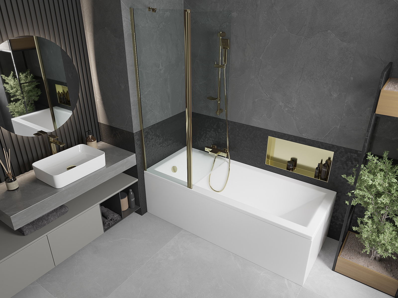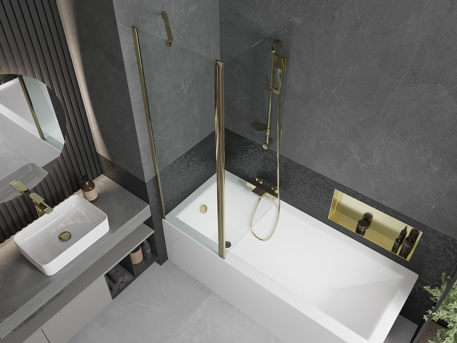 Параванът има едно подвижно крило с възможност за сгъване. Това решение позволява да се спести повече място в банята и да се използва свободно останалото пространство, когато не използваме зоната за къпане.