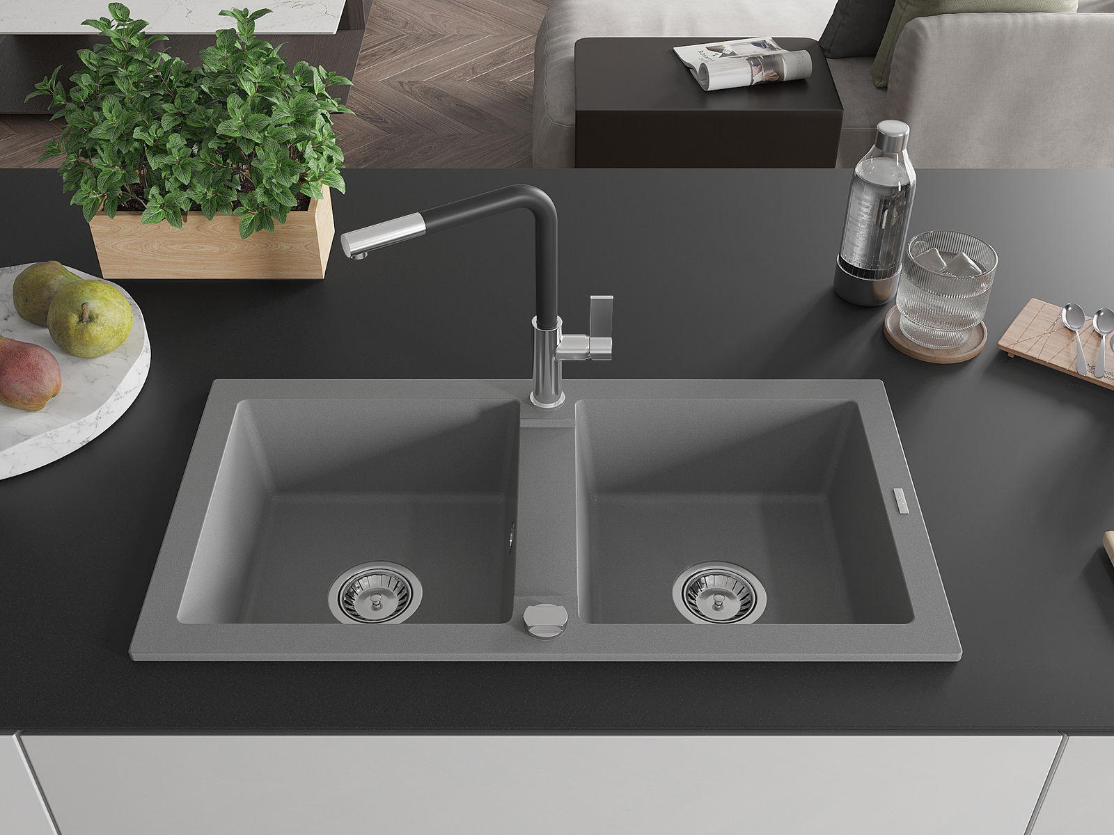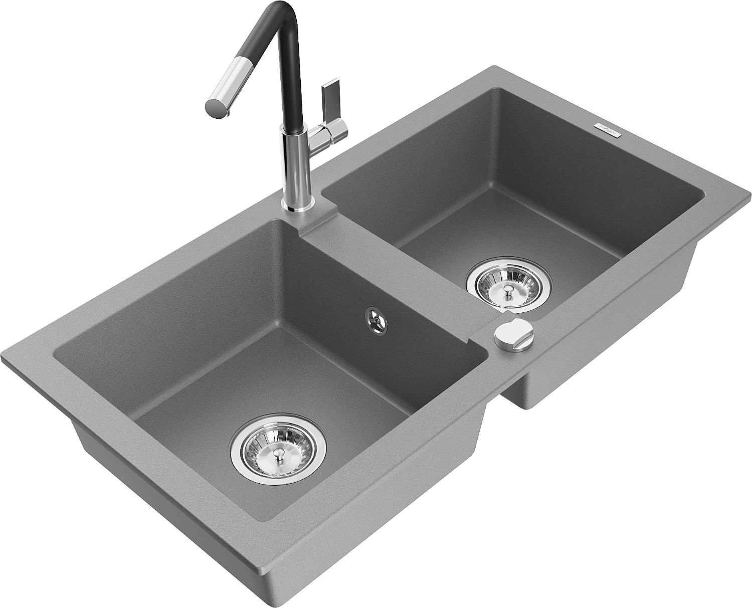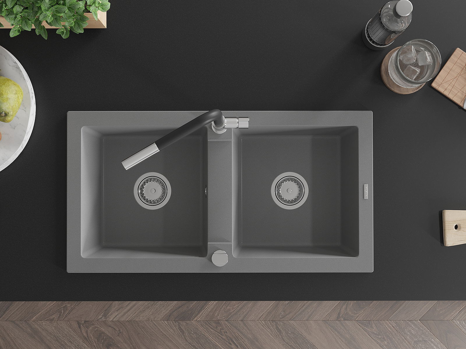 Mexen Mario гранитна мивка с 2 камери и кухненски смесител Flora, сив - 6504-71-670401-07