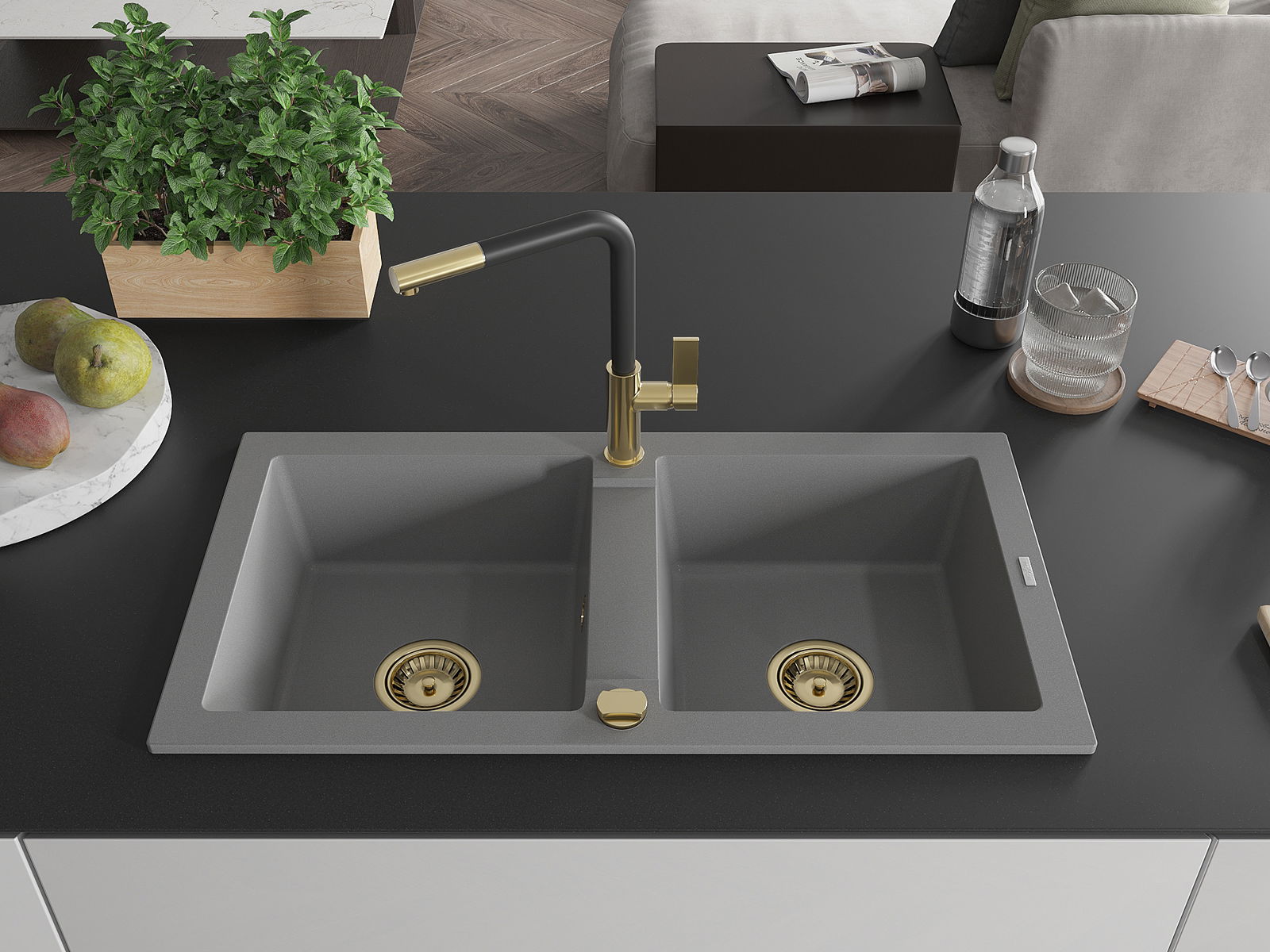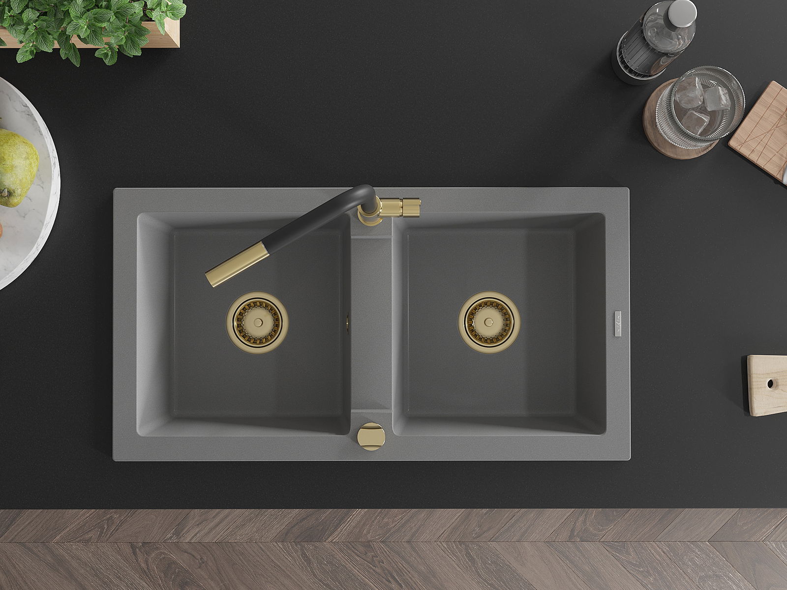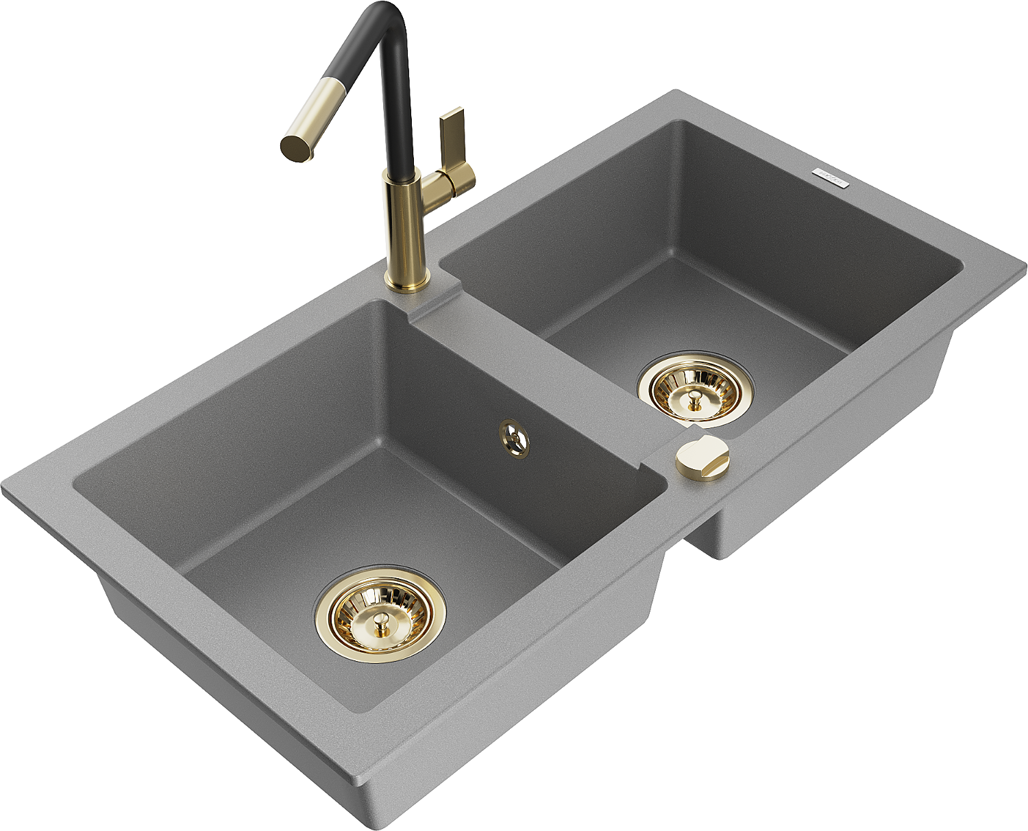 Mexen Mario гранитна мивка с 2 камери и кухненски смесител Flora, сив - 6504-71-670401-57-G