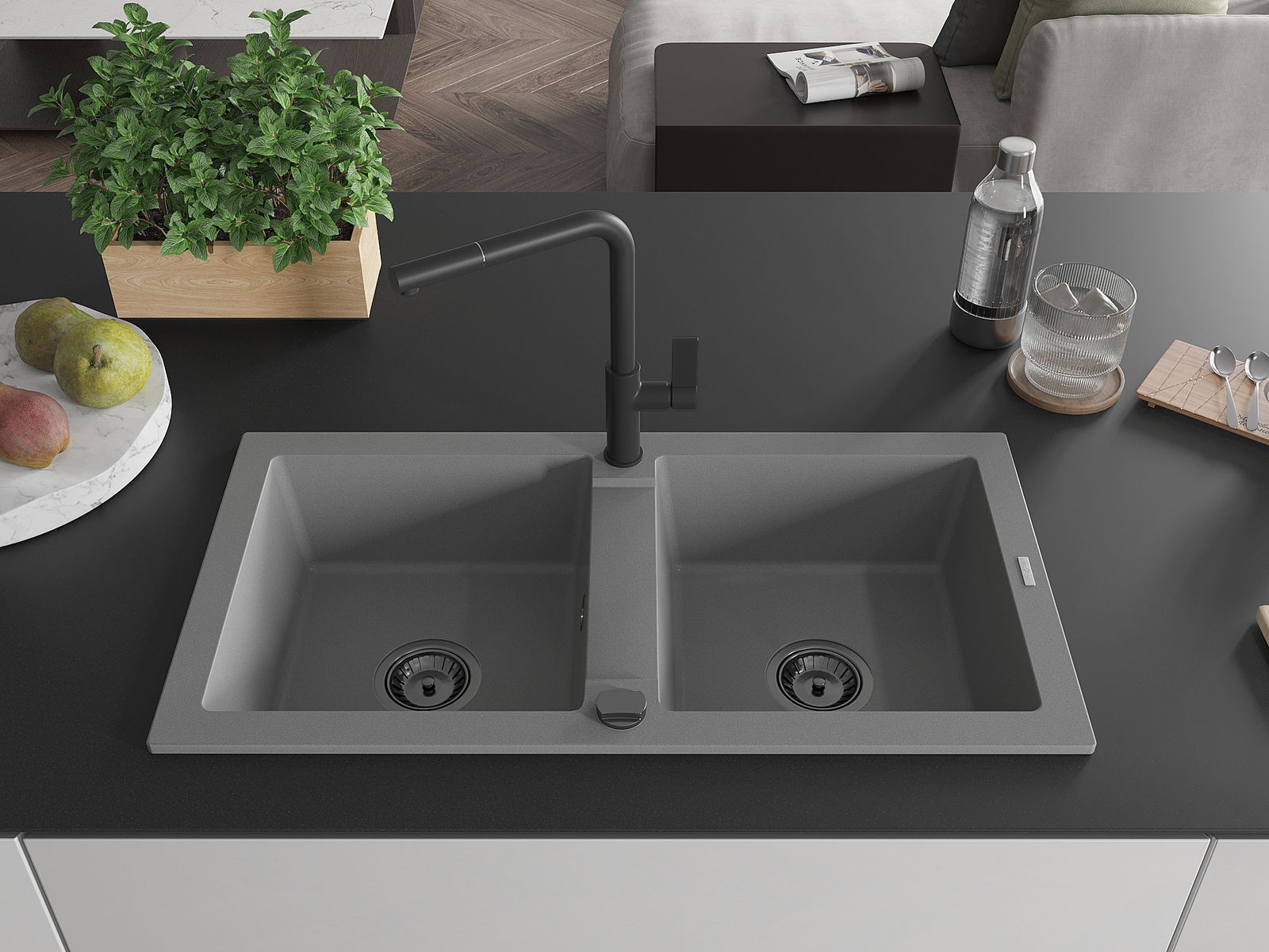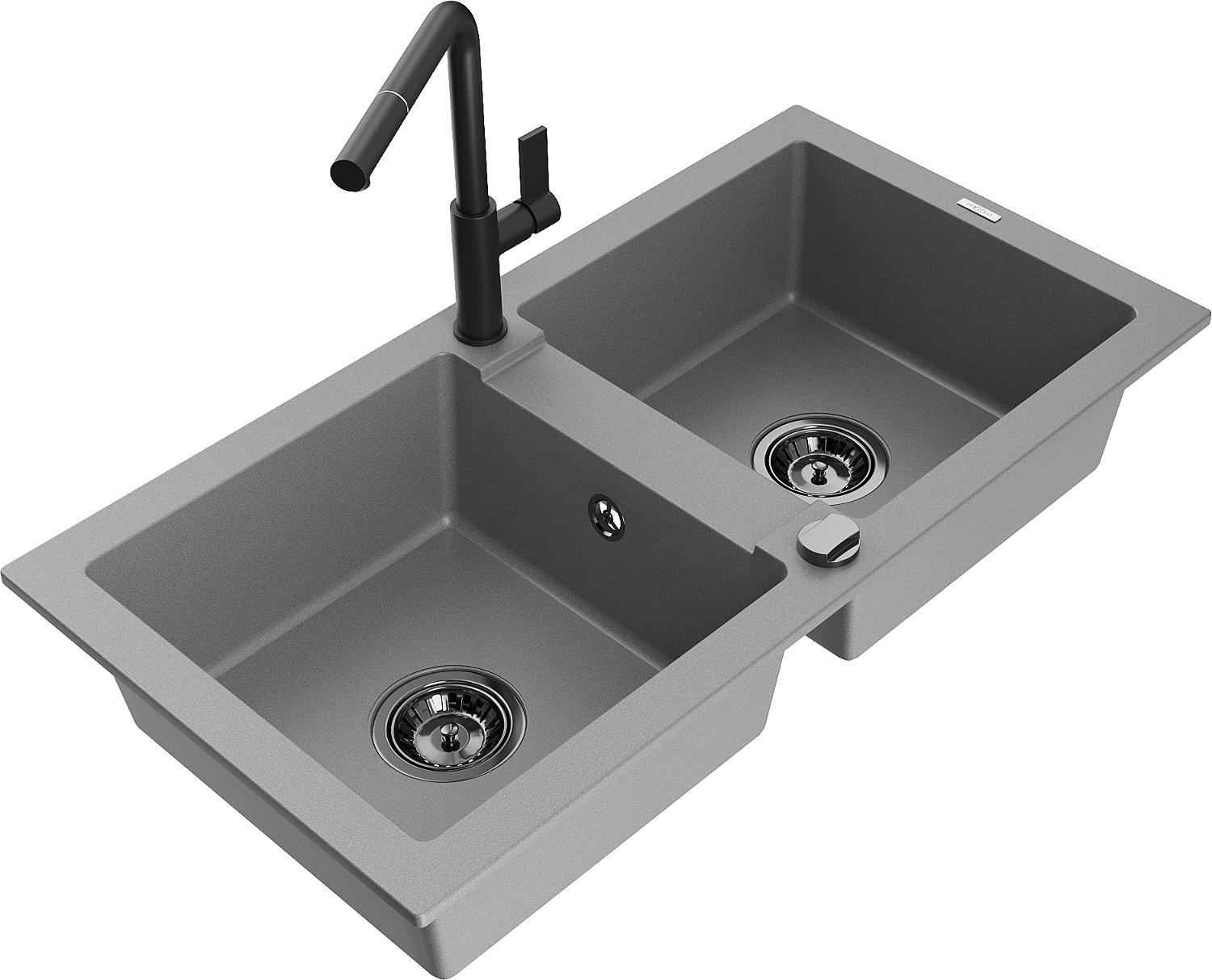 Mexen Mario гранитна мивка с 2 камери с кухненски смесител Flora, сив - 6504-71-670401-70-B