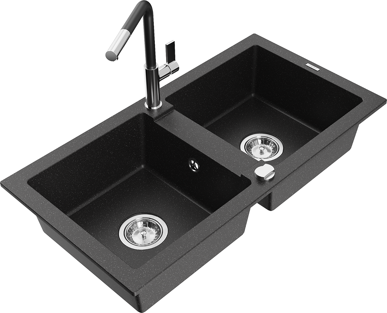 Mexen Mario Гранитна кухненска мивка с 2 камери и кухненски смесител Flora, черен/сребрист металик - 6504-73-670401-07