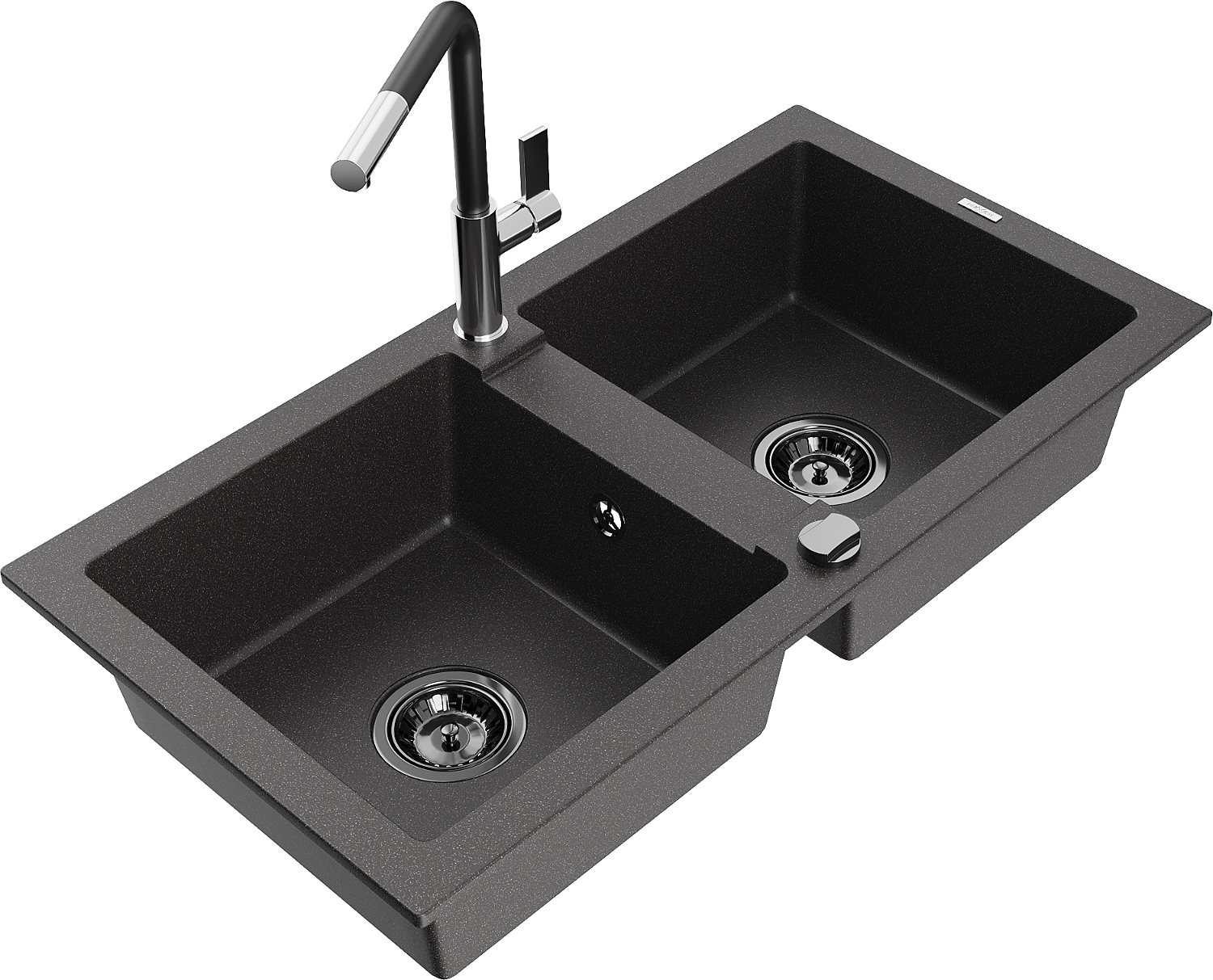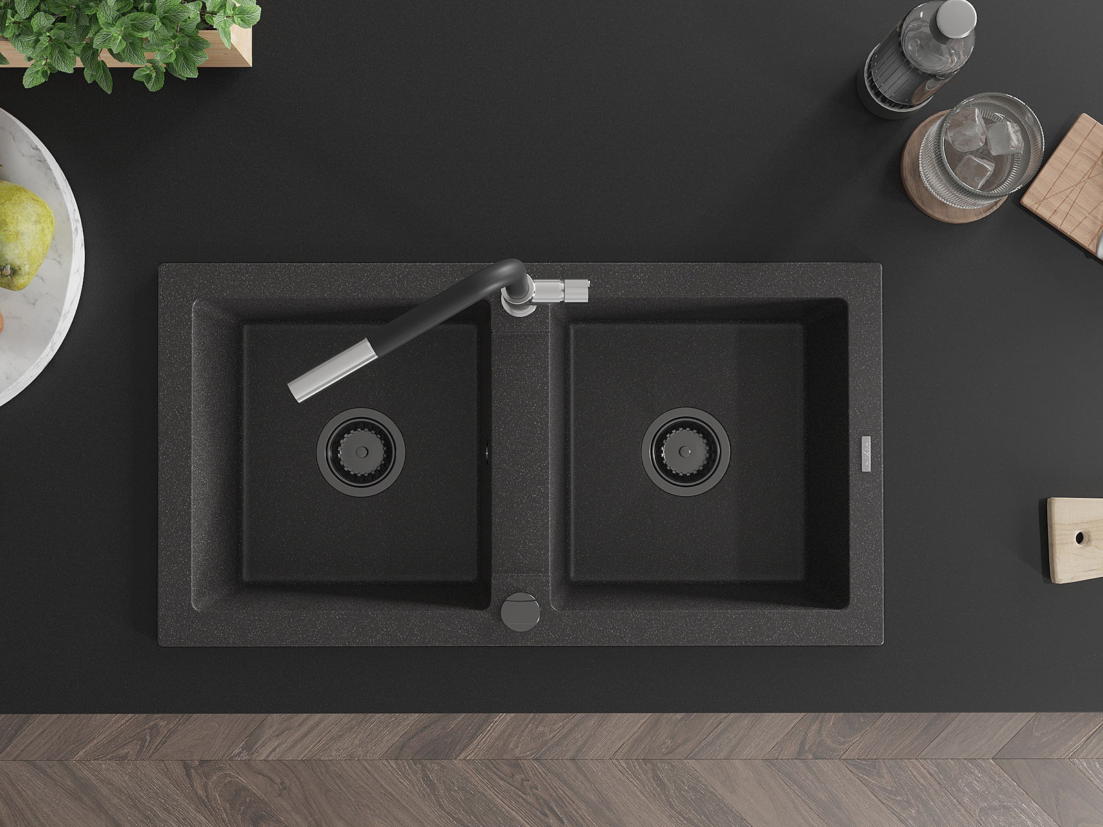 Mexen Mario мивка от гранит 2-камерна с кухненски смесител Flora, черен на точки - 6504-76-670401-07-B