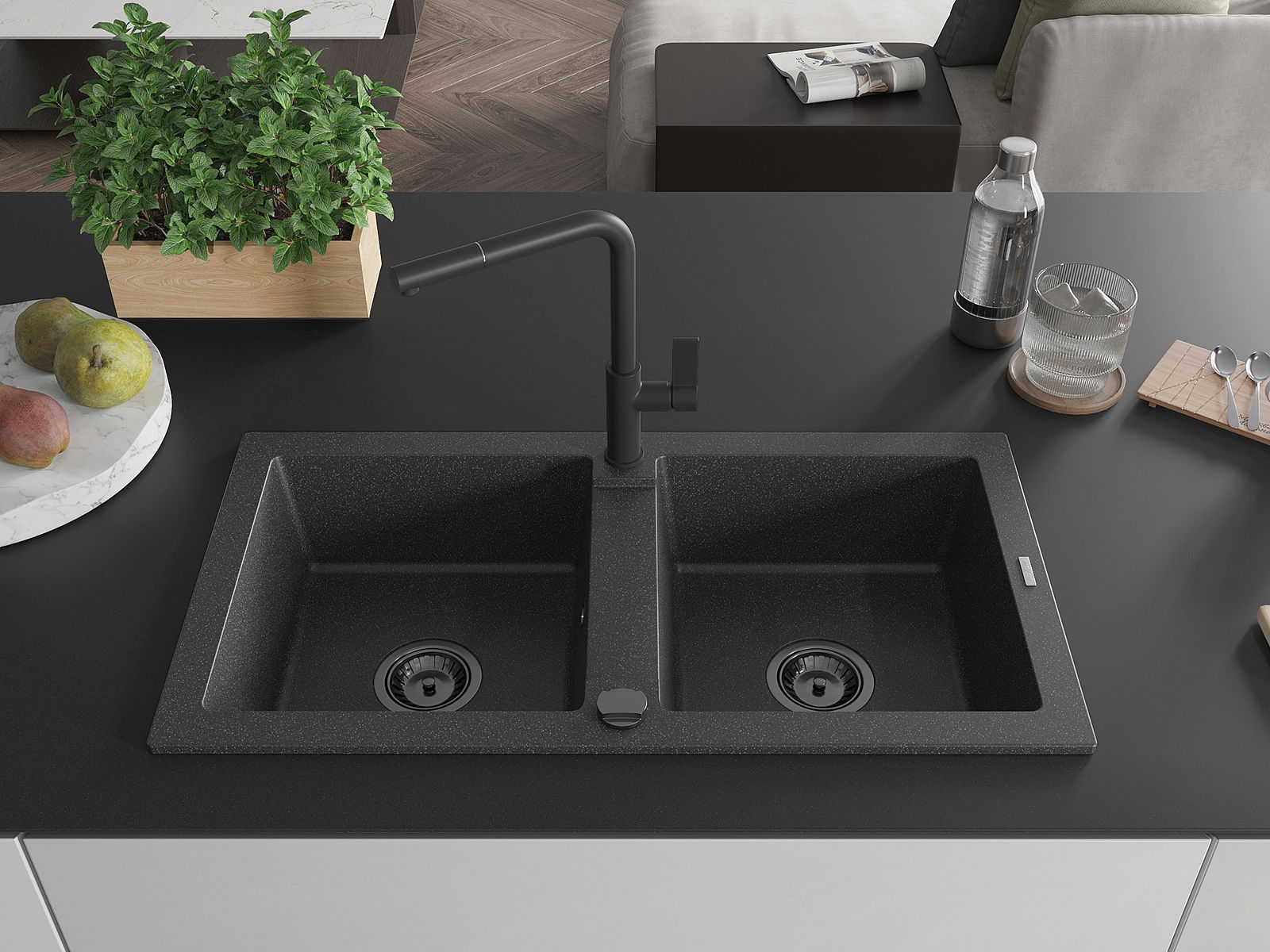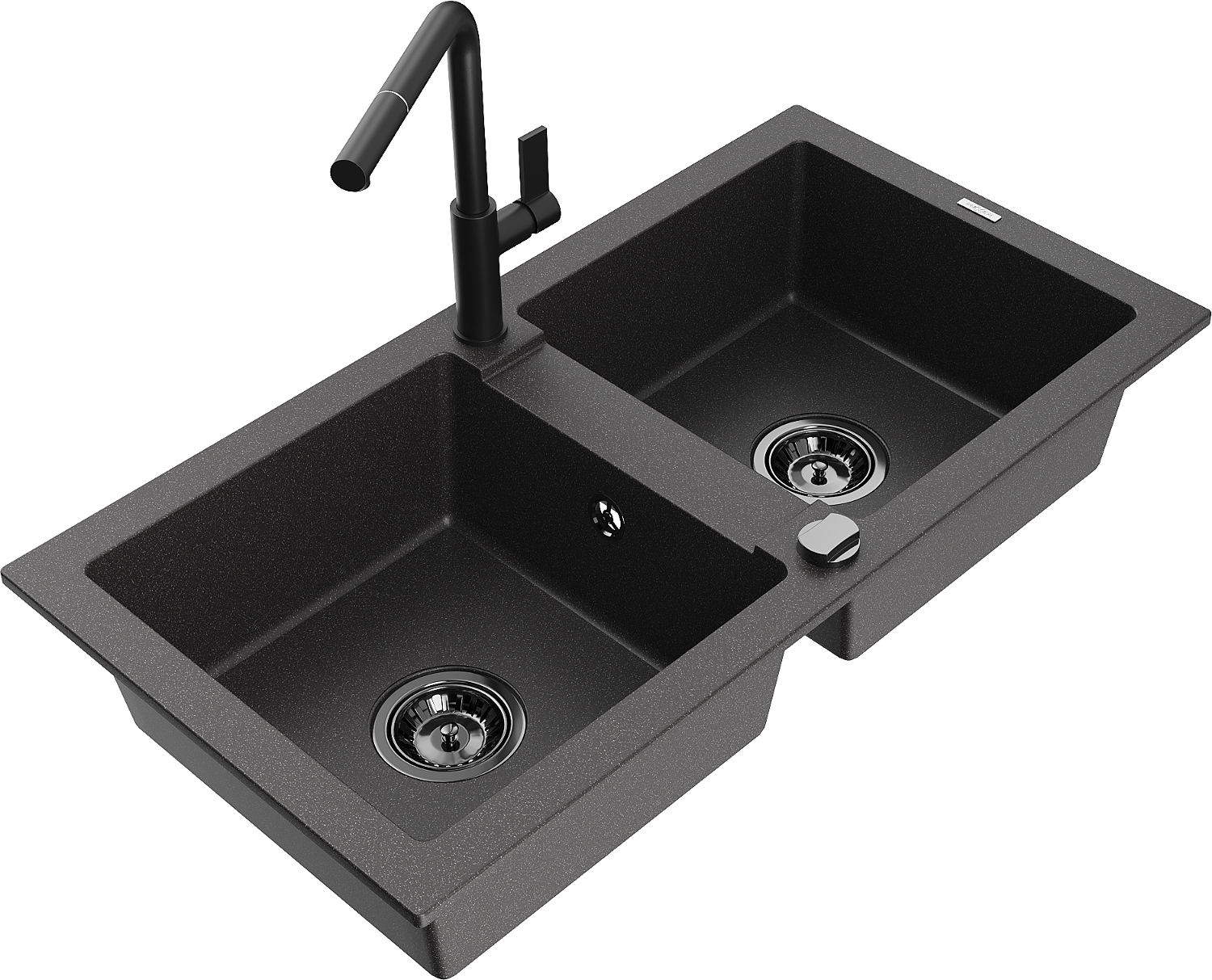 Mexen Mario гранитна мивка с 2 отделения с кухненски смесител Flora, черен напетен - 6504-76-670401-70-B