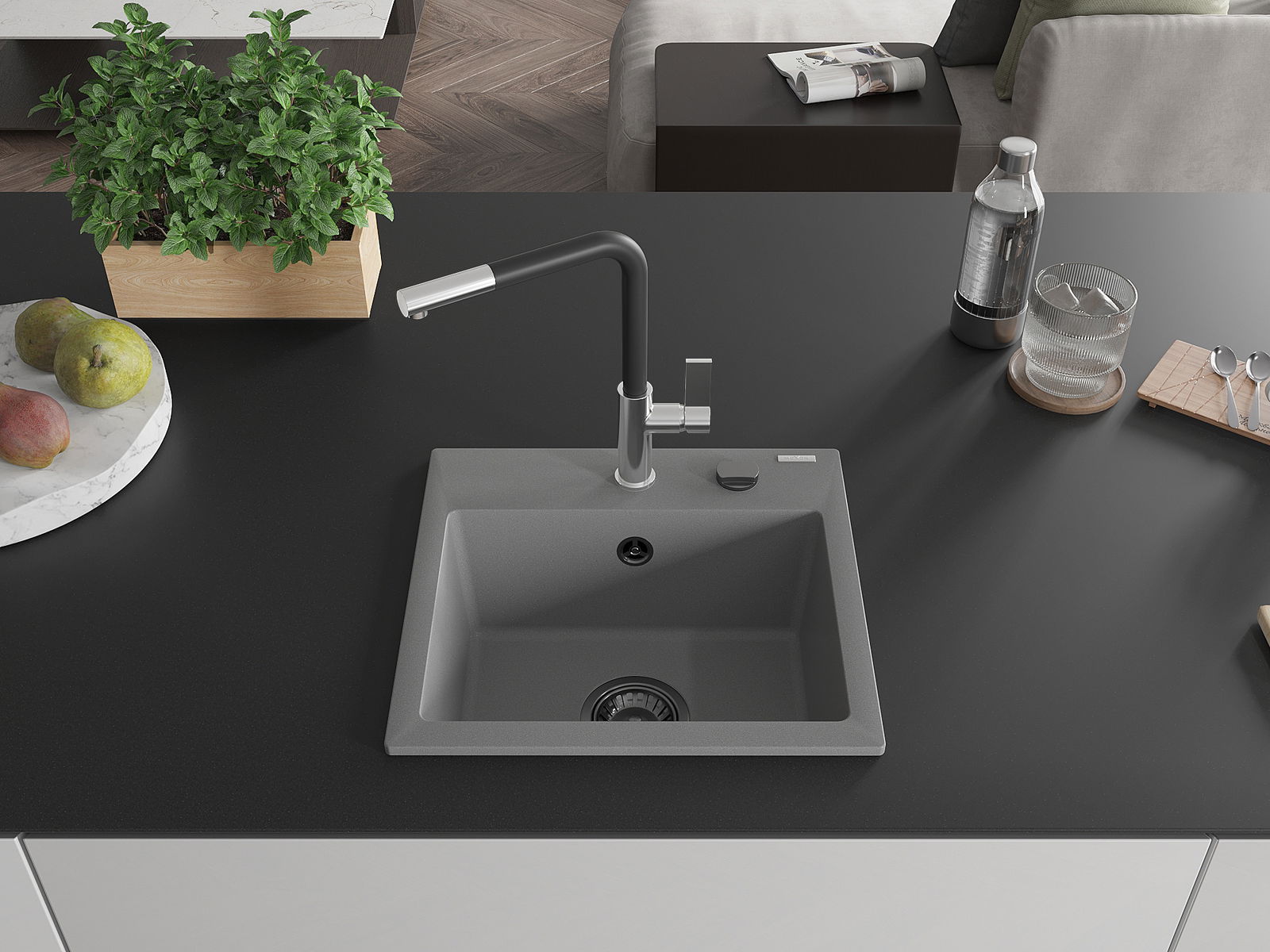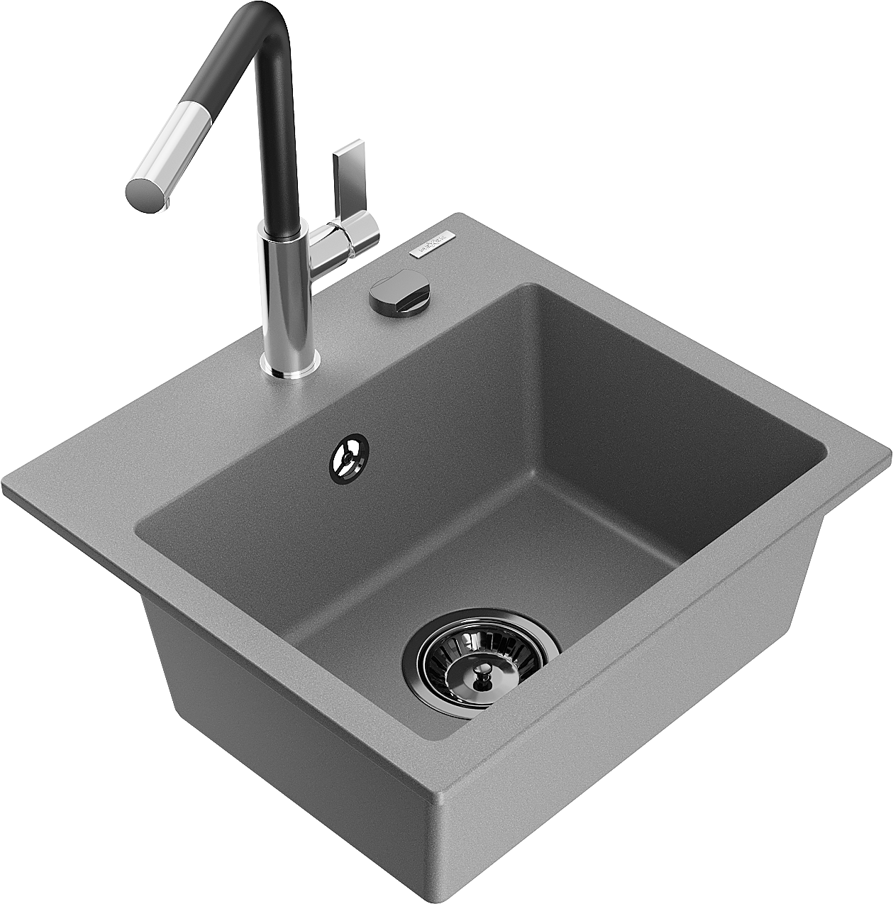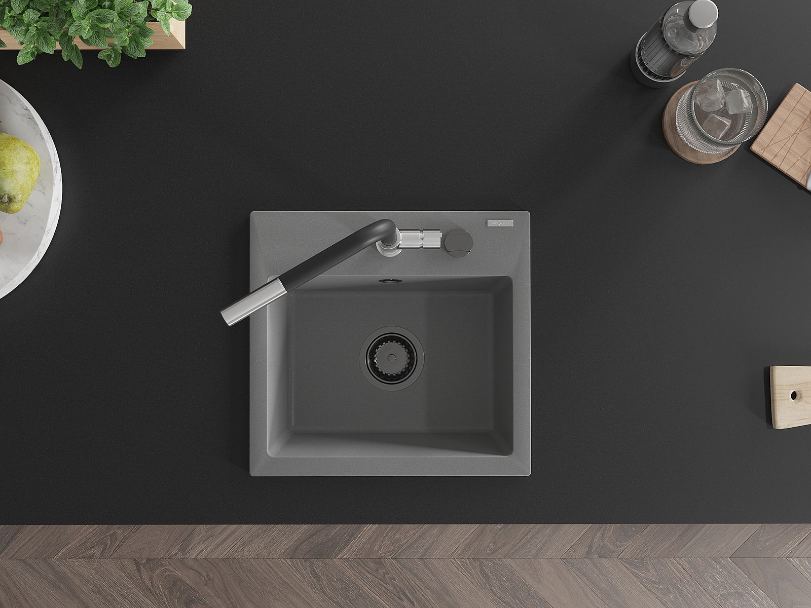 Mexen Milo кухненска мивка от гранит с 1 отделение и кухня батерия Flora, сив - 6505-71-670401-07-B
