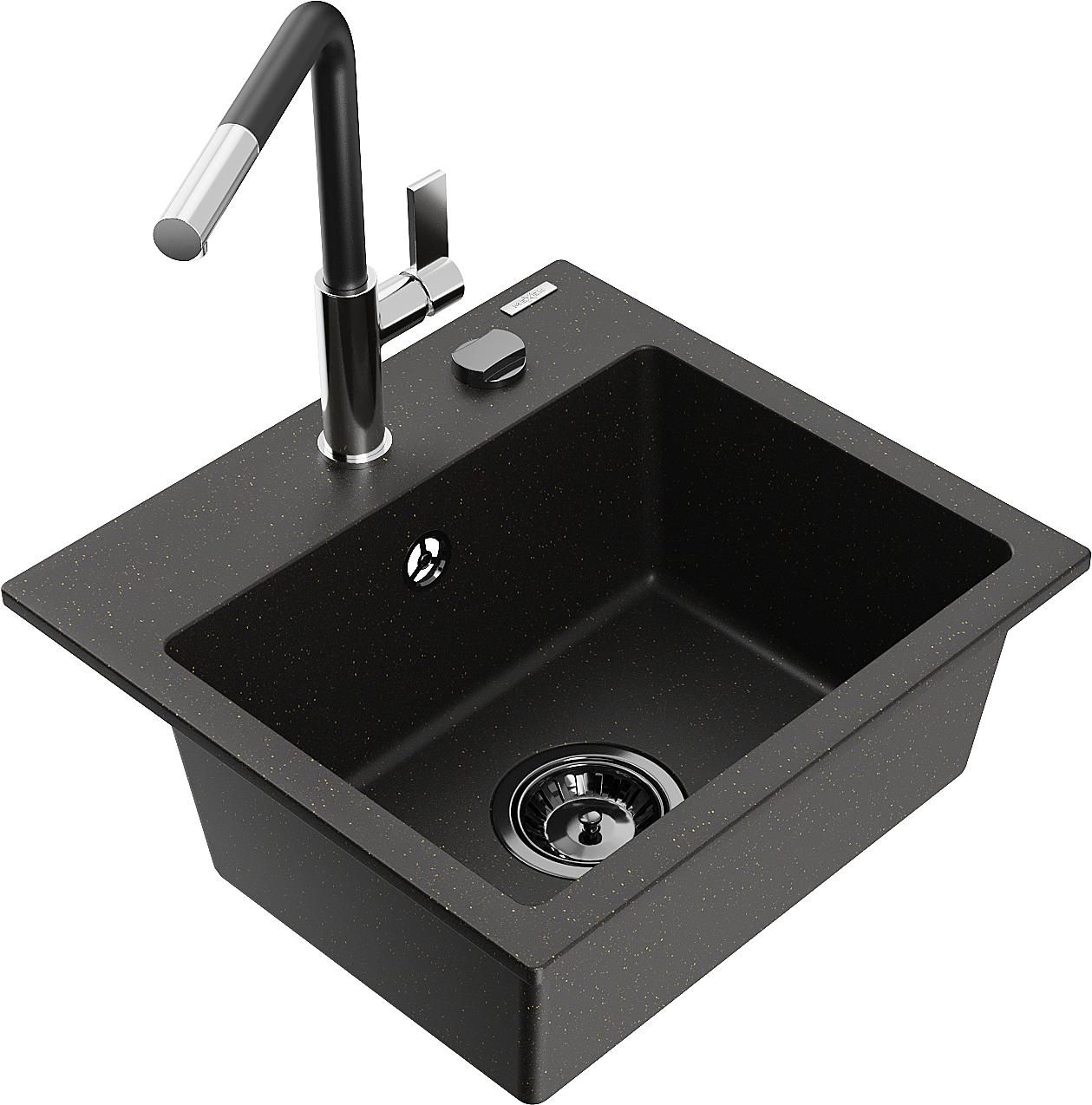 Mexen Milo гранитна кухненска мивка с 1 корито и кухненски смесител Flora, черно/златен металик - 6505-75-670401-07-B