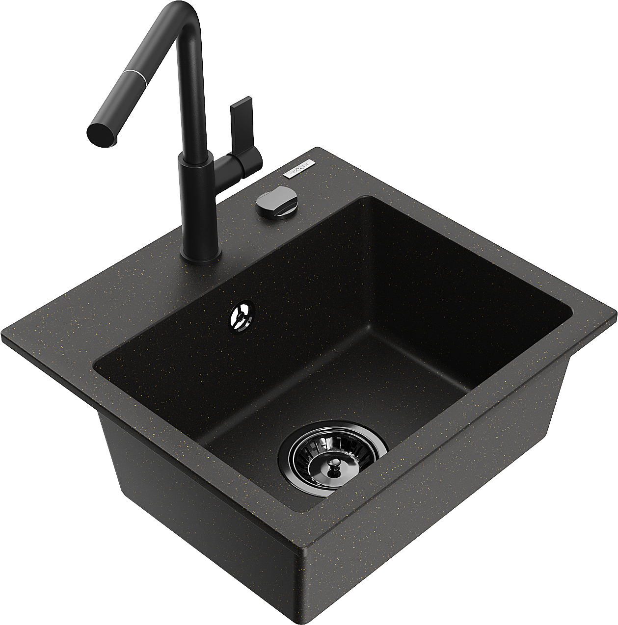 Mexen Milo гранитна кухненска мивка с 1 корито с кухненски смесител Flora, черно/златен металик - 6505-75-670401-70-B