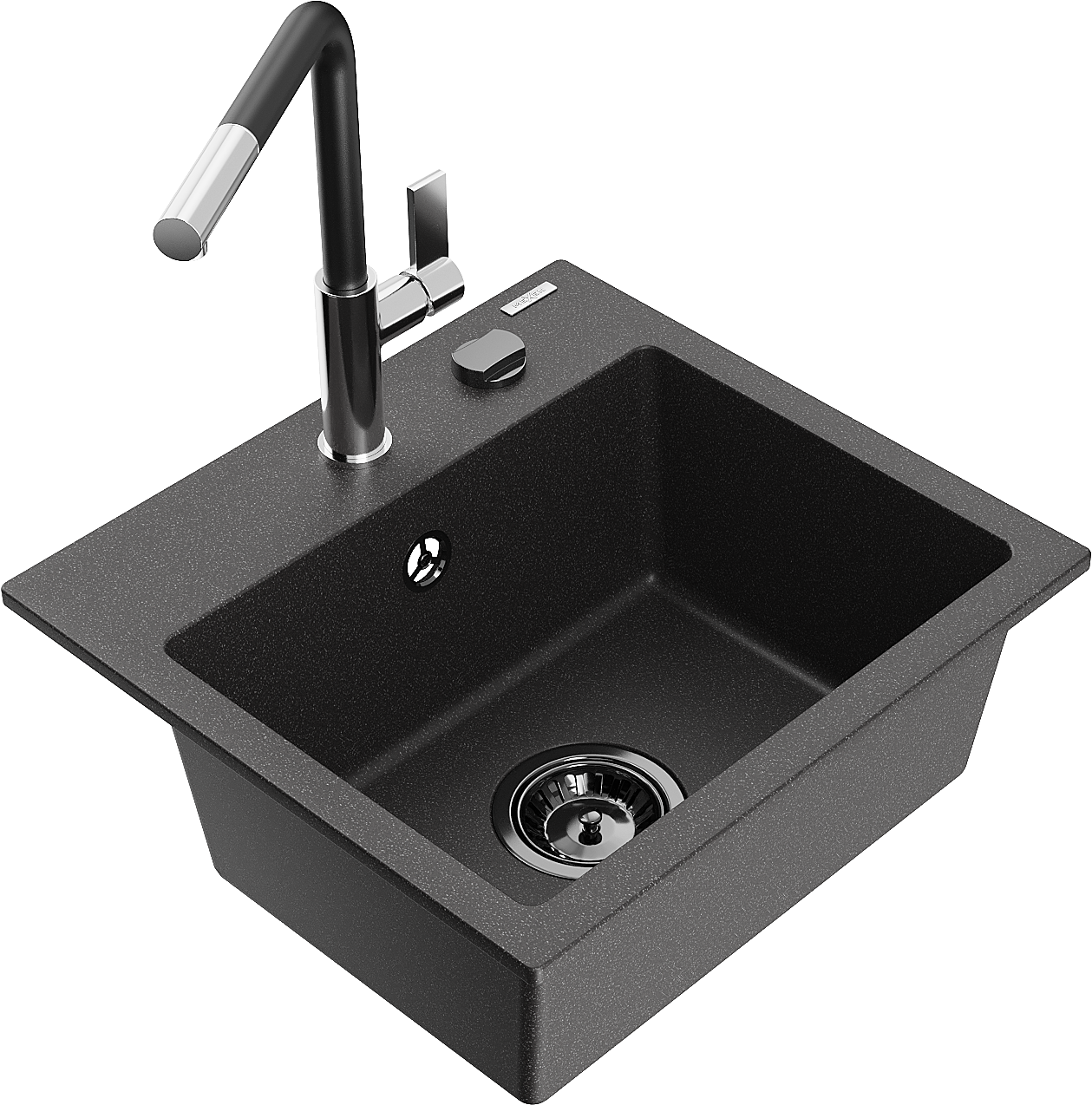Mexen Milo гранитна кухненска мивка с 1 корито и кухненски смесител Flora, черен с пръски - 6505-76-670401-07-B